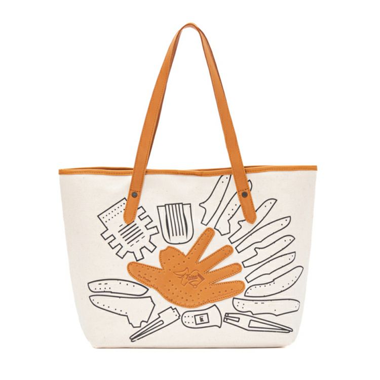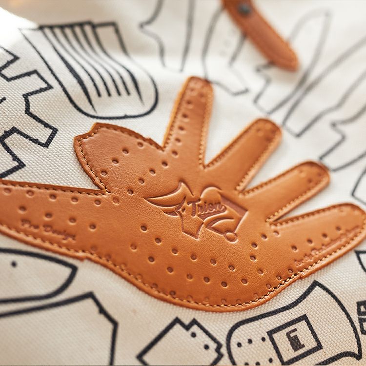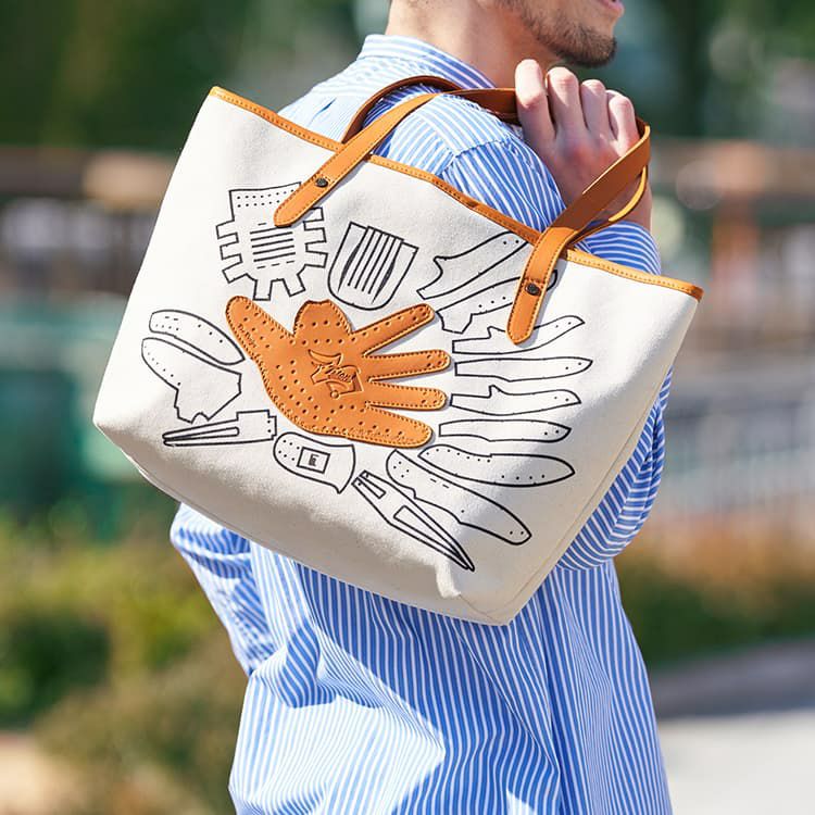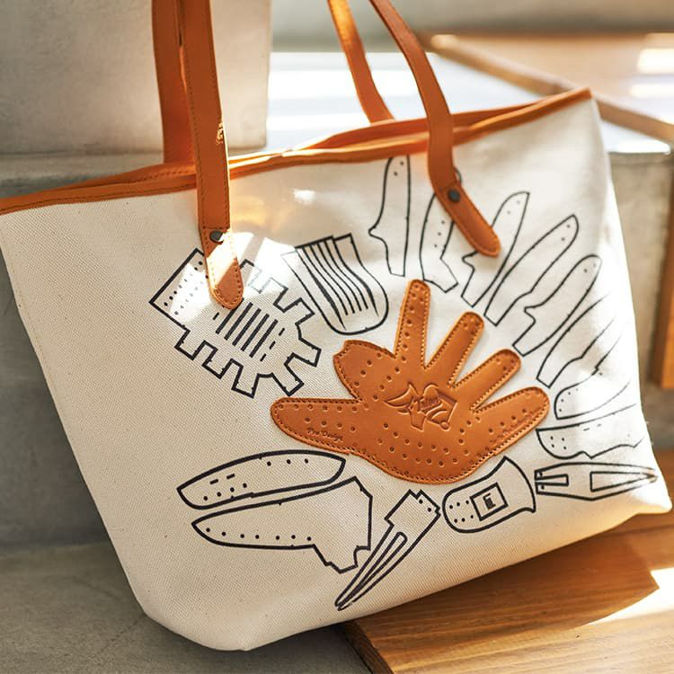 シンプルで無骨なキャンバストートに、野球グローブの「型紙」をモチーフにしたデザインを施しました。