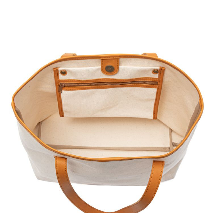 スナップボタンで大きく開く開口部は、荷物の出し入れがしやすく、内側にはジッパーポケットとオープンポケットも備え、整理整頓にも配慮。