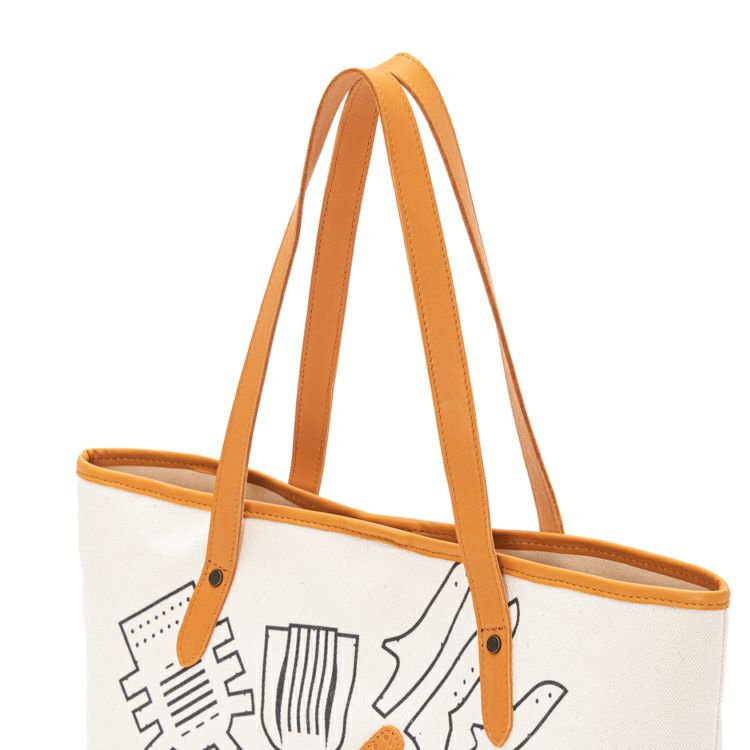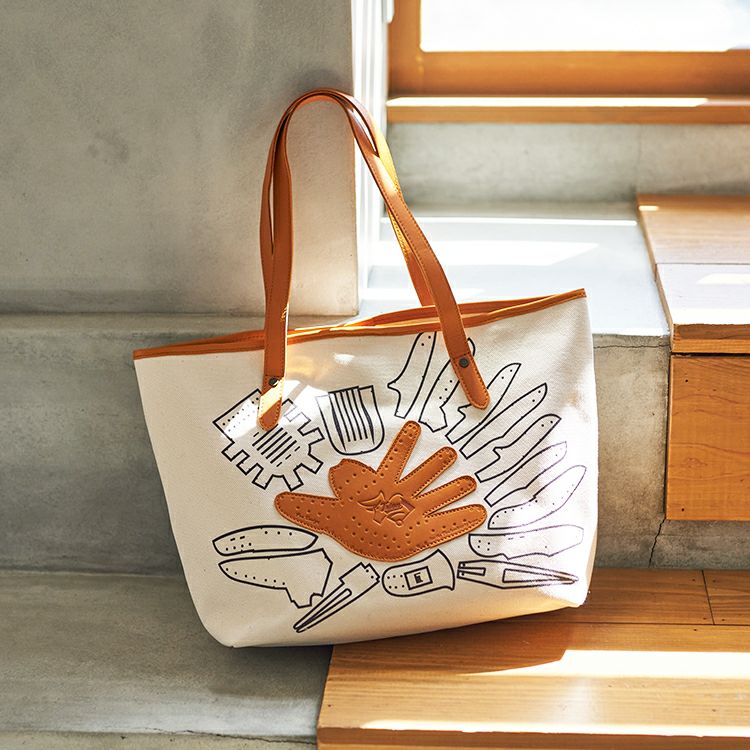 シンプルで無骨なキャンバストートに、野球グローブの「型紙」をモチーフにしたデザインを施しました。