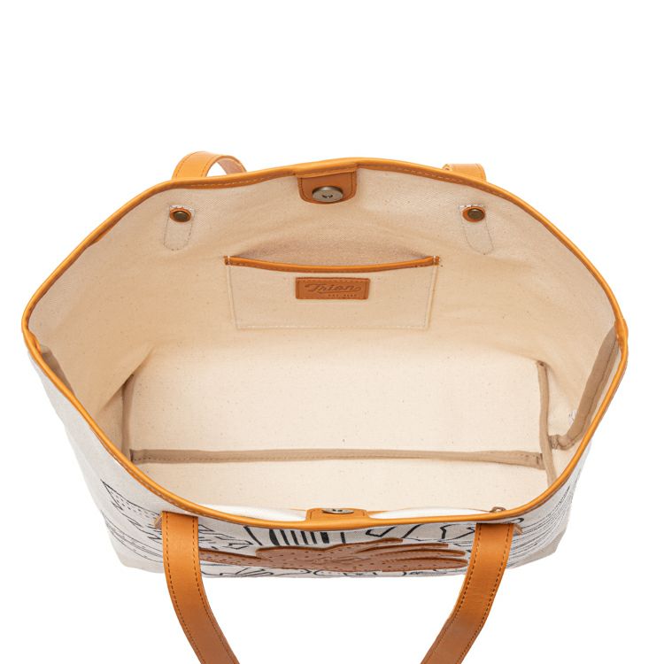 スナップボタンで大きく開く開口部は、荷物の出し入れがしやすく、内側にはジッパーポケットとオープンポケットも備え、整理整頓にも配慮。