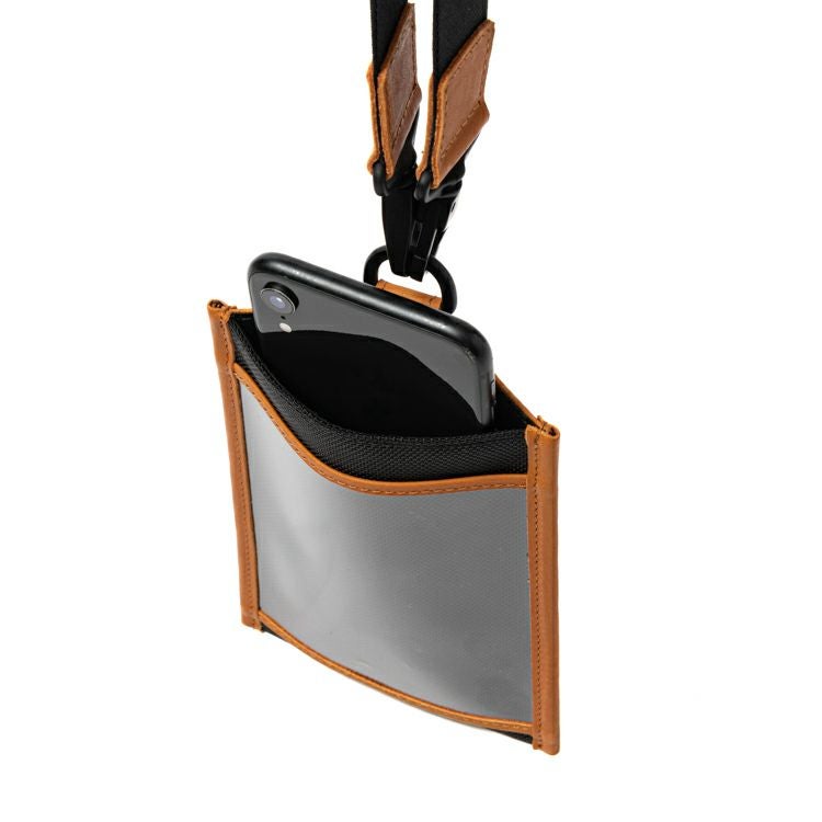チケットホルダーの片面はカードケース、もう片面は透明ポケットに。さらにセンターにスマホが入れられるポケットを装備。今回のためにラリーさんにデザイン頂いた、オリジナルのステッカーシール付きです。ストラップは取り外し可能で、バッグにつけてショルダー使いにもできる2way仕様です。