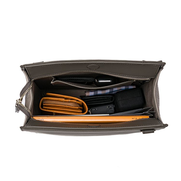 形のイメージは「箱型」。前面と背面にハリ感のあるグラブレザーを使用し、型崩れせず、自立も可能に。サイドは肉厚で柔らかいタンブルレザー(シボ革)を使用。マチを柔らかな革にすることで、荷物が少ない時はマチを折り畳んですっきりと、多い時はマチを広げて使える自由度の高さが魅力。
