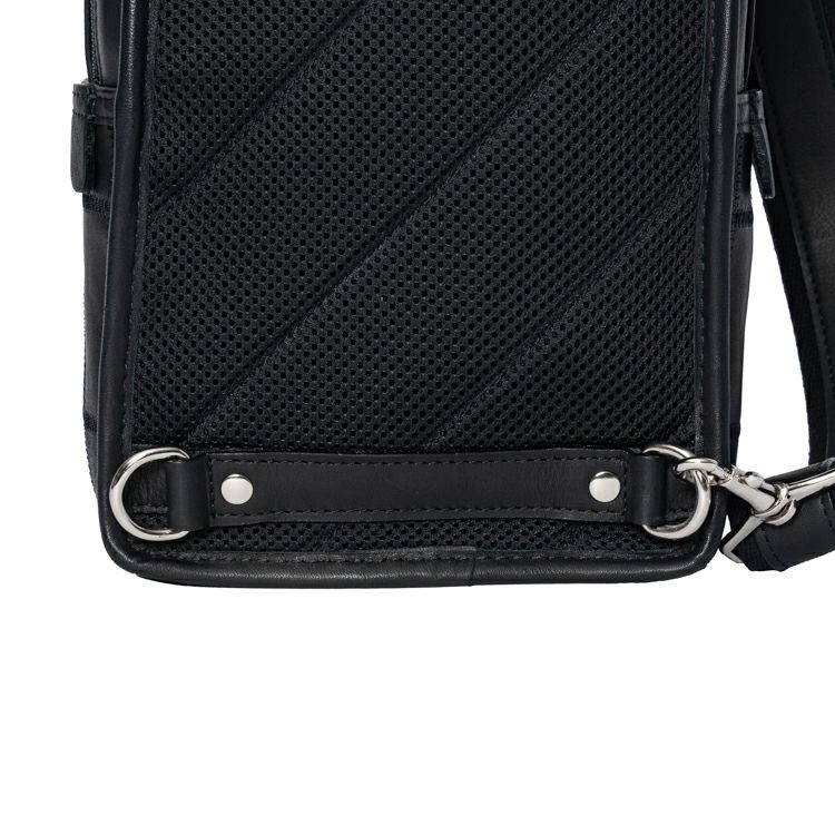 左右どちらでも持てるよう、背面下部にショルダーベルトが付け替え可能なDカン付き。さらに背面はメッシュ素材を採用し、長時間着用した際も蒸れを軽減します。