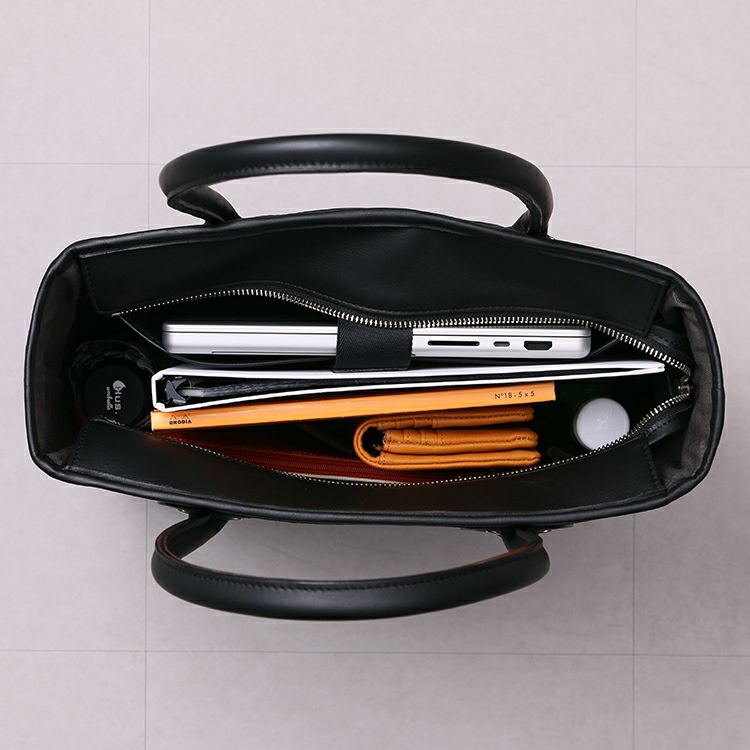 開口部には天ファスナーを採用しているので、中身が見えず、移動中も安心です。背面にはスマートフォンや定期など、すぐに取り出したいものを入れておける便利な外ポケットを配置。
