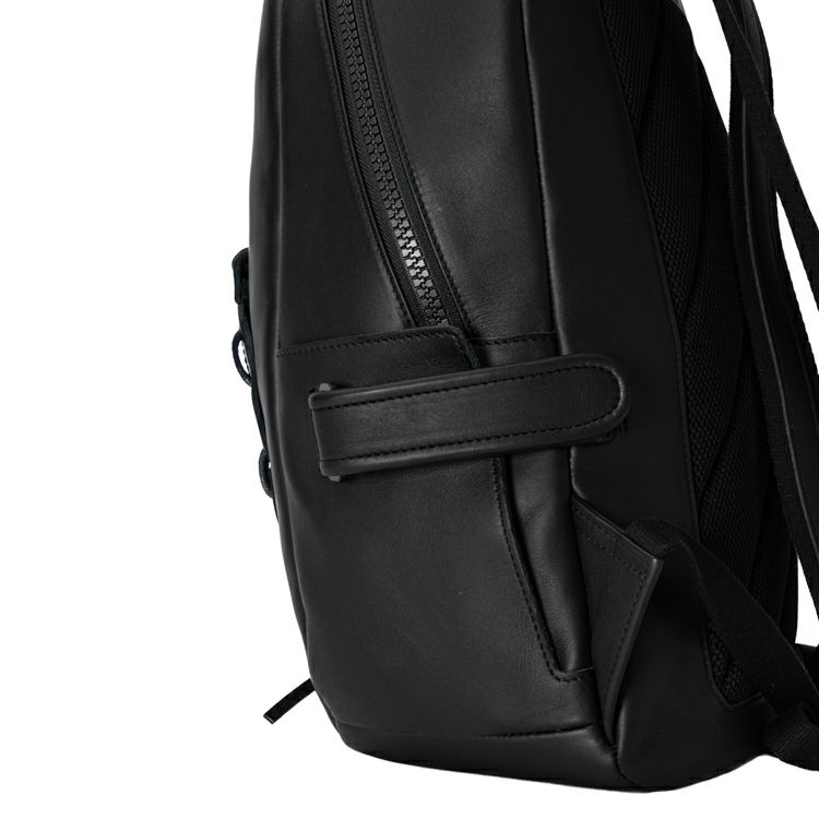 背中側はクッション材入りのメッシュ素材を採用し、長時間背負っても蒸れにくく快適です。また、背胴右側にスマホやパスケースを収納できる便利なジッパーポケット付き。開口部はダブルジッパーで大きく開く構造。内装生地は上品なベロア調で、オープンポケット2つ、ジッパーポケット1つ付きです。