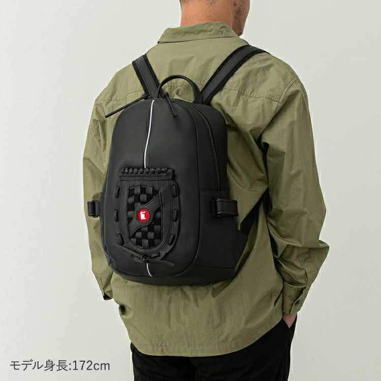 野球グローブに使われるグラブレザーを使用。丈夫な作りで触り心地や匂いもグローブそのもの。バッグ正面にグローブのウェブ部分をあしらったデザインは、オープンポケットとしてスマホやカードケースも収納できます。正面上部のホワイトラインは、野球グラブの指部分に用いられる「ハミダシ」と呼ばれる構造を採用。
