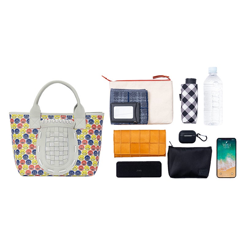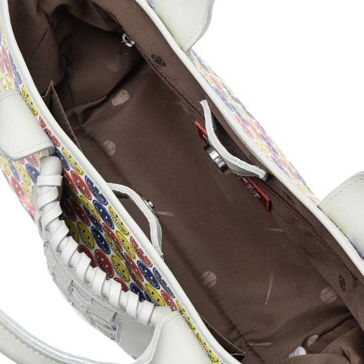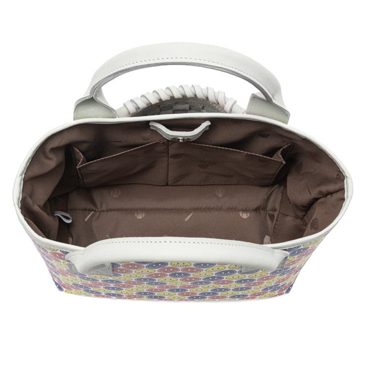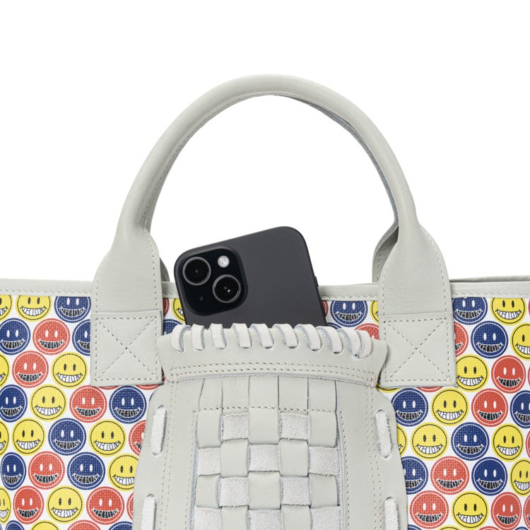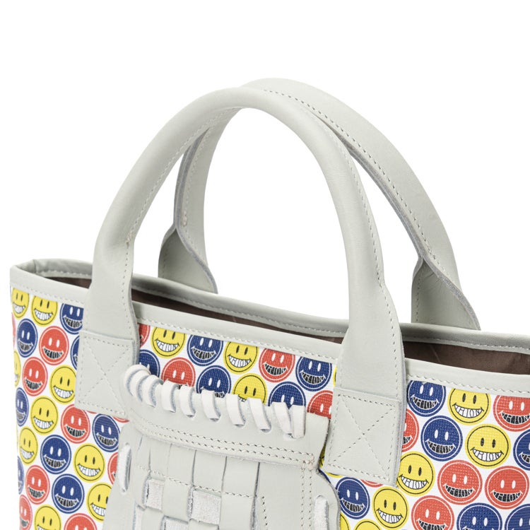 中央のバスケットウェブ部分は、本革で丁寧に編み込んだ本格仕様。可愛さの中にグラブメーカーならではのこだわりがさりげなく宿っています。スマイルマークのポップなデザインと本革の上質な存在感が、唯一無二のミニトートを生み出しました。