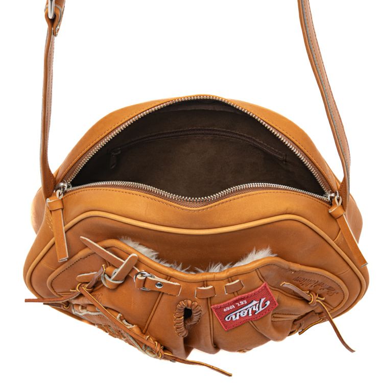シンプルなショルダーバッグの前面に、大胆に本物のFast backグローブを貼りつけたショルダーバッグ。前面のグローブ部分はポケットになっており、本物のグローブ感をお楽しみ頂けます。