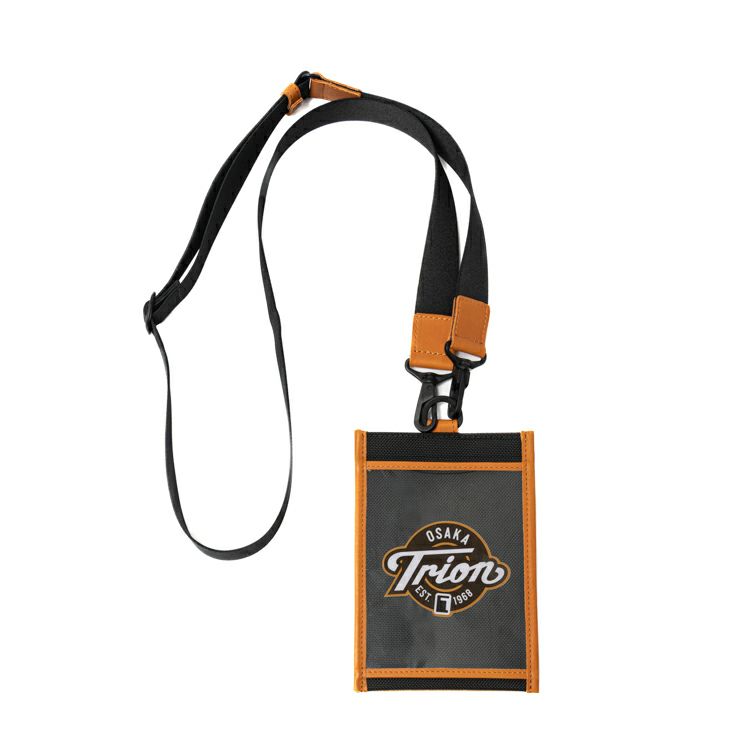 チケットホルダーの片面はカードケース、もう片面は透明ポケットに。さらにセンターにスマホが入れられるポケットを装備。今回のためにラリーさんにデザイン頂いた、オリジナルのステッカーシール付きです。ストラップは取り外し可能で、バッグにつけてショルダー使いにもできる2way仕様です。