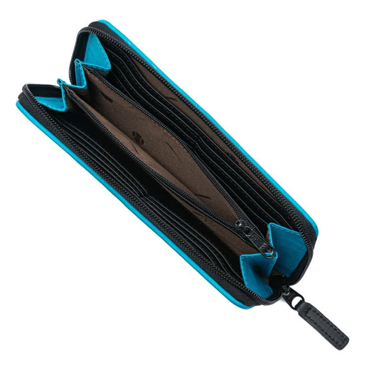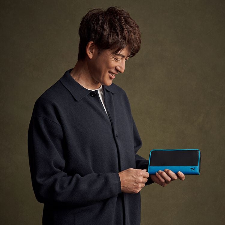 外装には、野球グローブにも使われるタフでしなやかなグラブレザーを使用。ブラック×ブルーのコントラストが目を引きながらも、派手すぎない品のある存在感で、使う人の個性を際立たせます。