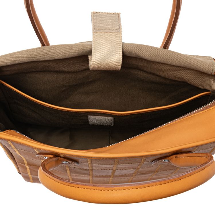 ハンドルの長さを見直すことで、従来よりも肩掛けがしやすくなりました。また、底面には新たに底鋲(そこびょう)を追加。床置き時にも安定し、革の摩耗や型崩れを防ぎながら、美しい状態を長く保つことができます。さらに、サイドマチには一枚革の補強パーツをプラス。荷物を多く入れても型崩れしにくく、耐久性が増すだけでなく、視覚的なアクセントにもなり、全体の印象を整えてくれます。