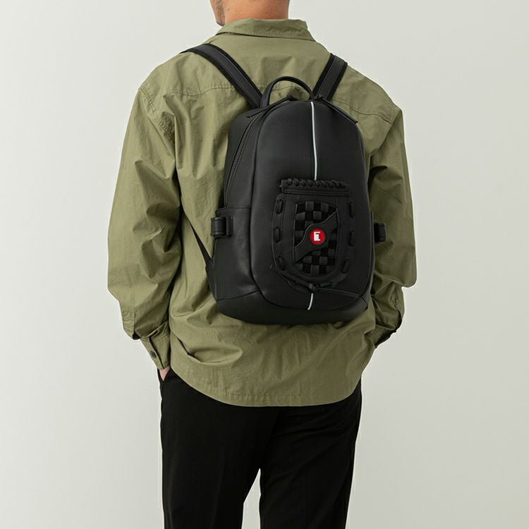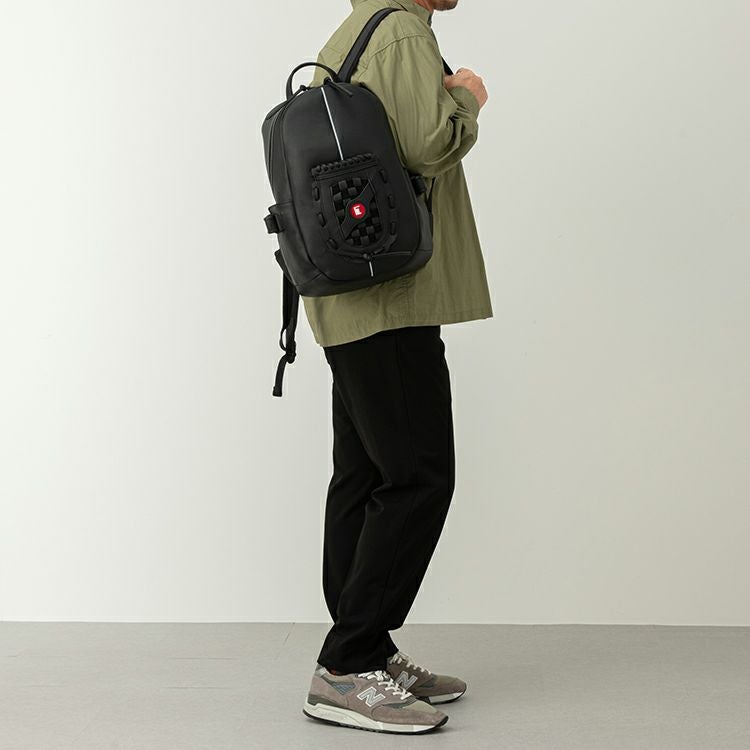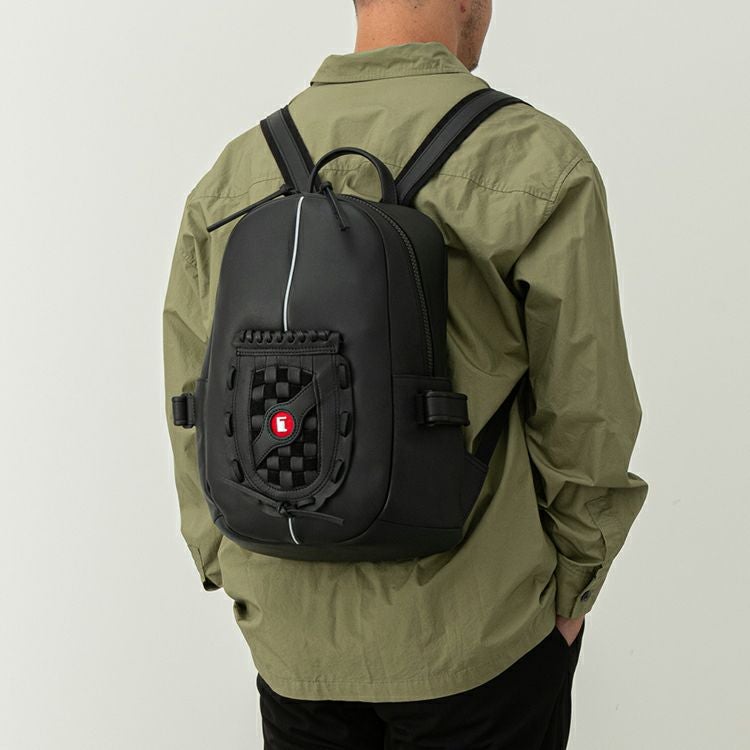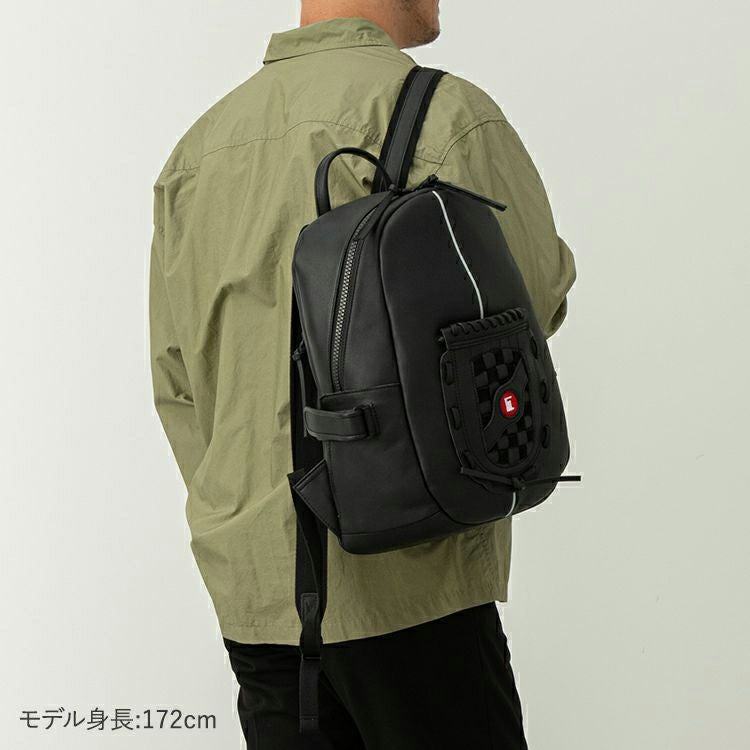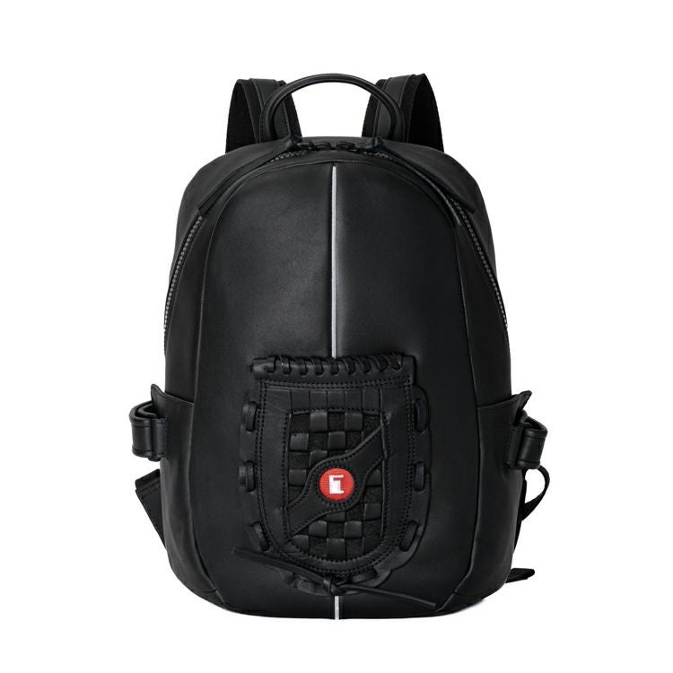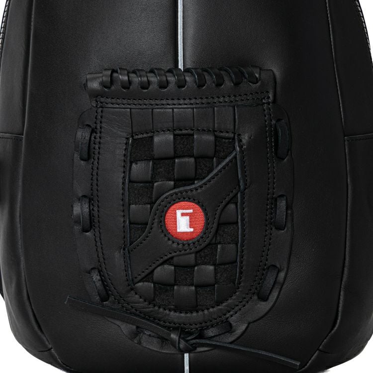 野球グローブに使われるグラブレザーを使用。丈夫な作りで触り心地や匂いもグローブそのもの。バッグ正面にグローブのウェブ部分をあしらったデザインは、オープンポケットとしてスマホやカードケースも収納できます。正面上部のホワイトラインは、野球グラブの指部分に用いられる「ハミダシ」と呼ばれる構造を採用。