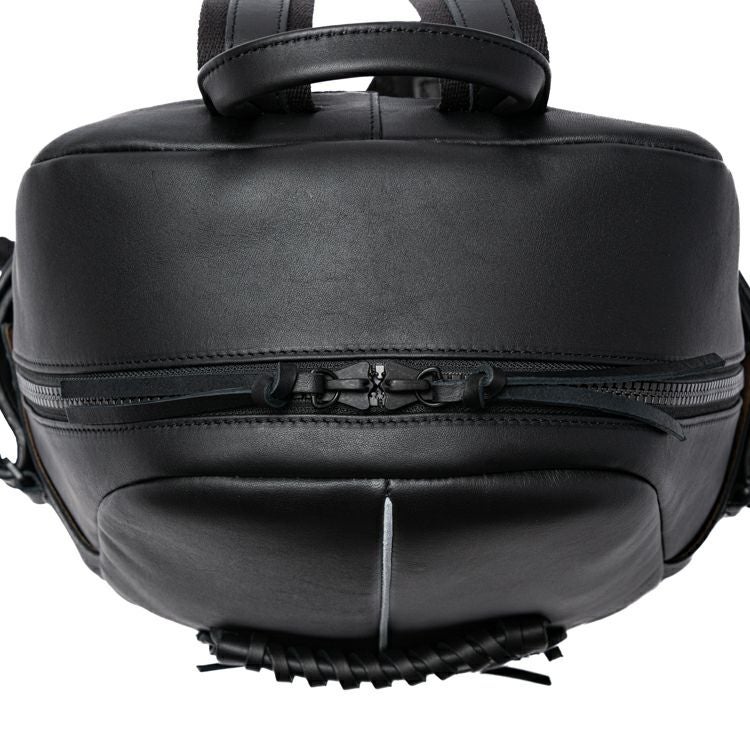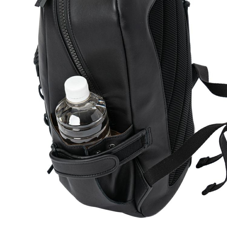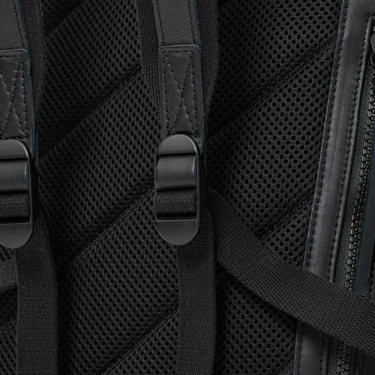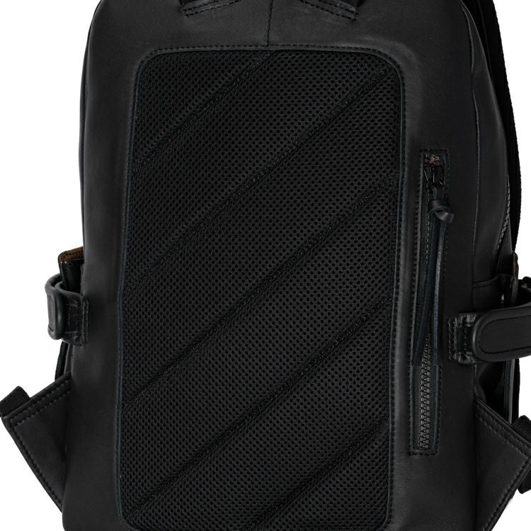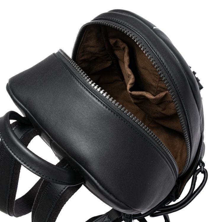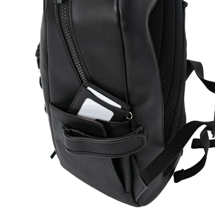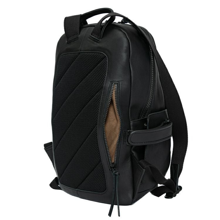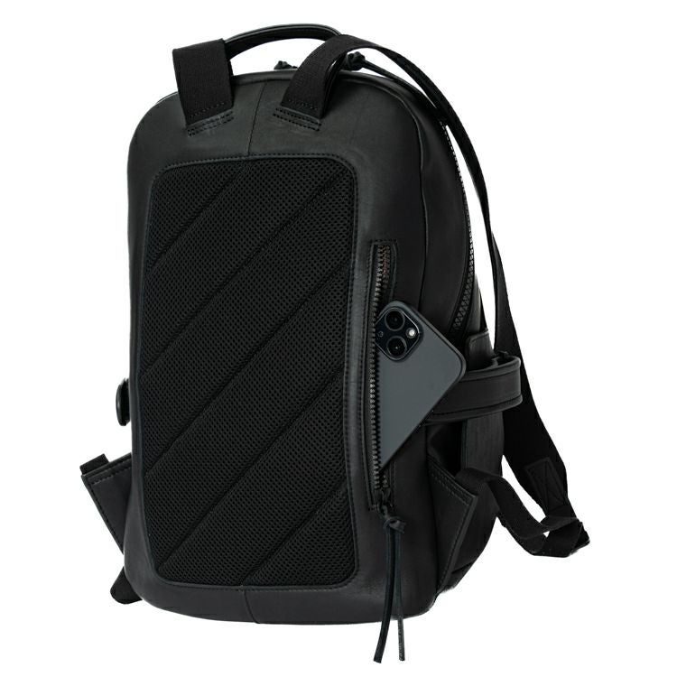 背中側はクッション材入りのメッシュ素材を採用し、長時間背負っても蒸れにくく快適です。また、背胴右側にスマホやパスケースを収納できる便利なジッパーポケット付き。開口部はダブルジッパーで大きく開く構造。内装生地は上品なベロア調で、オープンポケット2つ、ジッパーポケット1つ付きです。