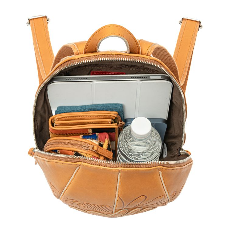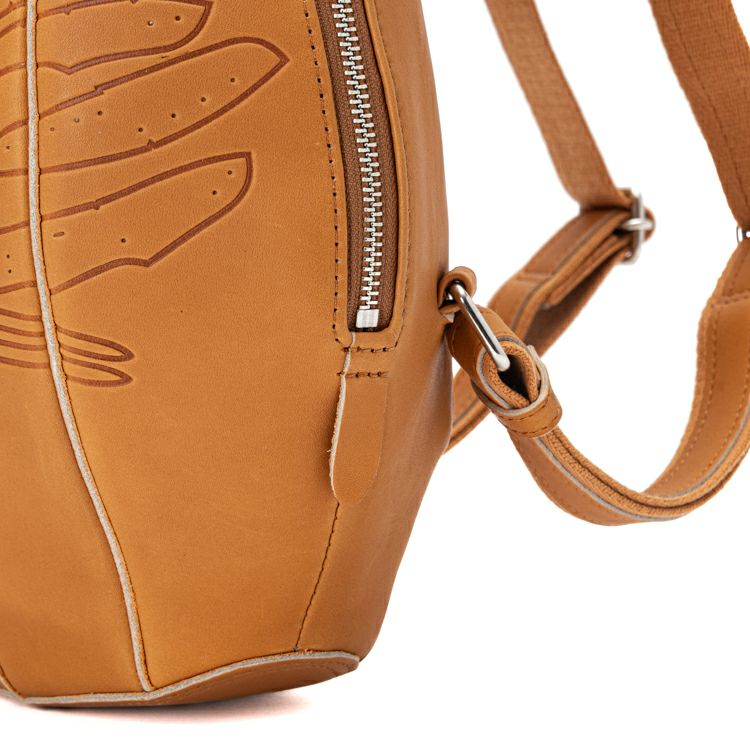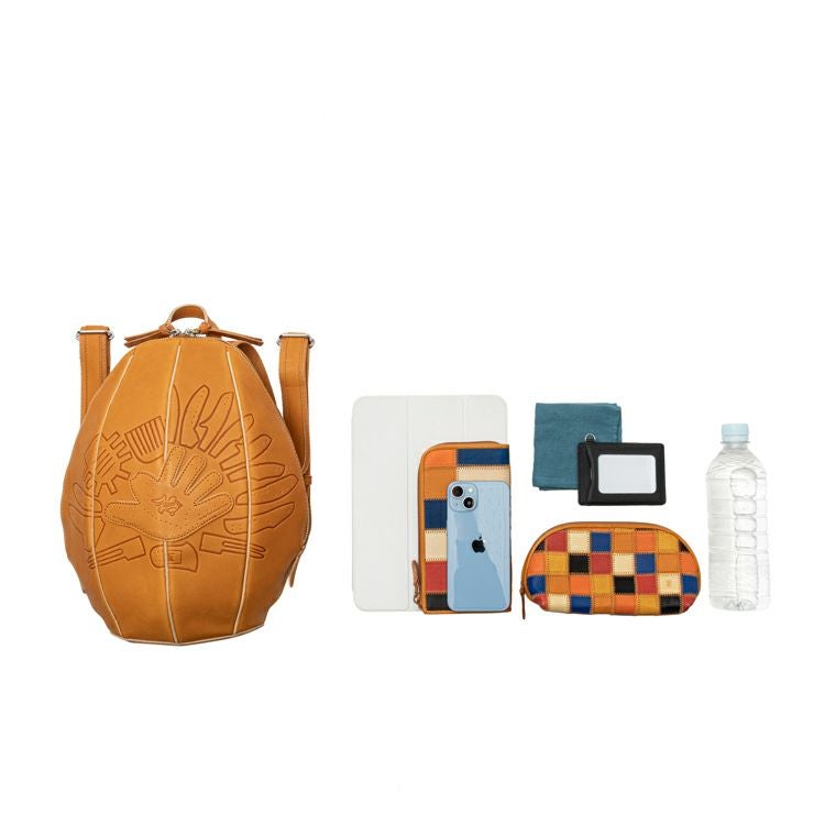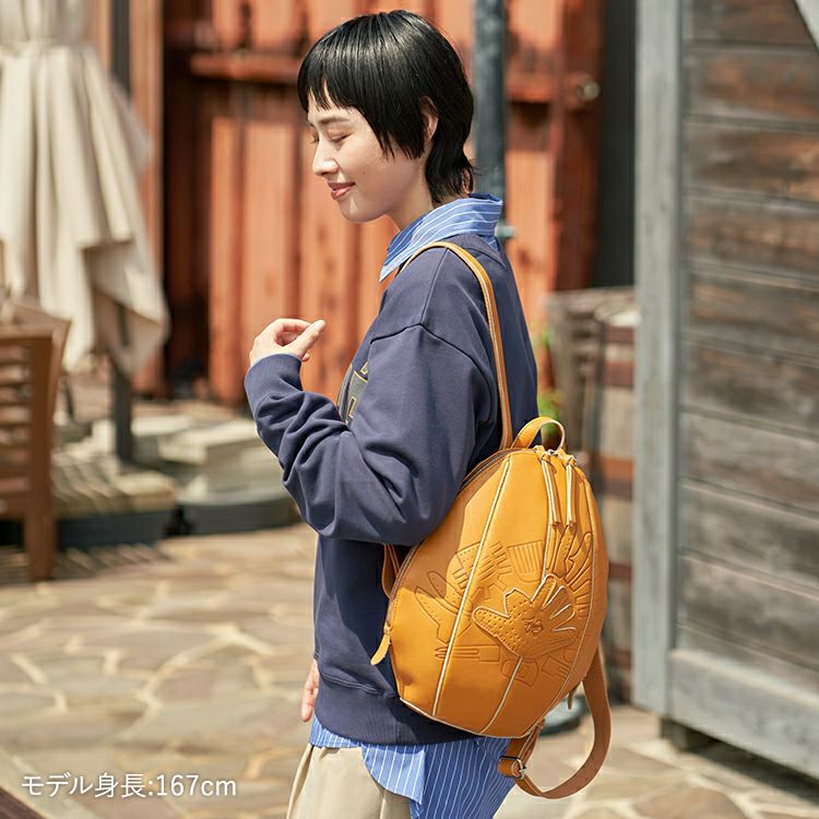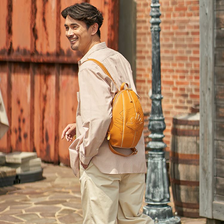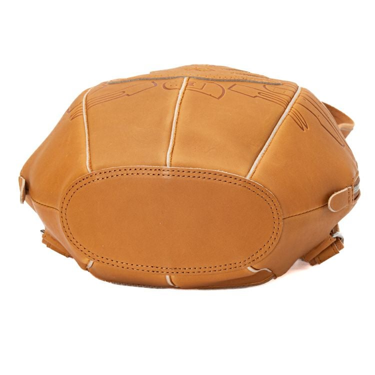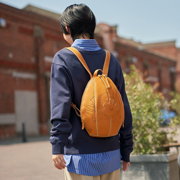 見た目の特徴は、何といってもグローブのような立体感。丸く包み込むようなフォルムになるよう、胴体部分にグローブづくりの「ハミダシ仕様」を採用し、グローブの構造美をバッグへと昇華しました。背負って歩くと左右に揺れる可愛さがあり、クッション性を高めた背胴部分が長時間の使用も快適にしてくれます。また、重さも約 560gで、背負った時の軽さにも驚くはず。
