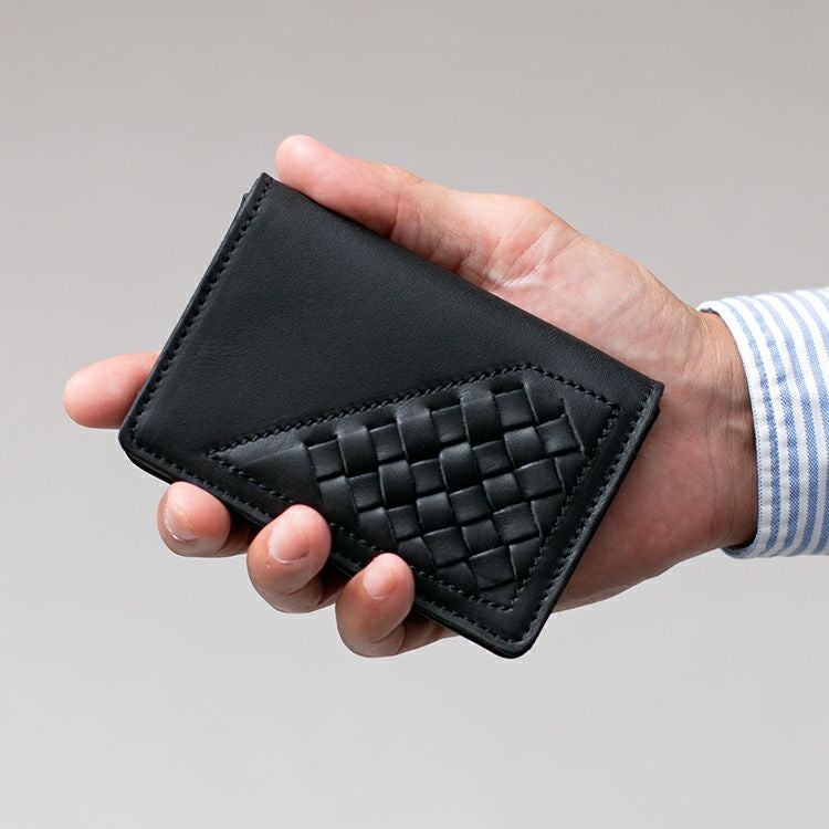 ケース正面は野球グローブのバスケットウェブをモチーフに、職人が一目ずつ革を編み込んだ丁寧なつくり。さらに、野球グローブと同じ太めの5番糸を使って縫製。野球経験者など見る人が見れば分かるデザインがポイントです。