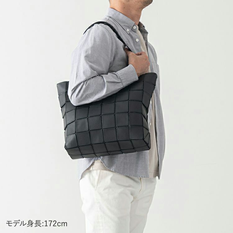 正方形に裁断した革を等間隔で配置することで、ナイロン素材のベースがちらりと覗き、フォルムに自然な柔軟性と表情を生み出します。