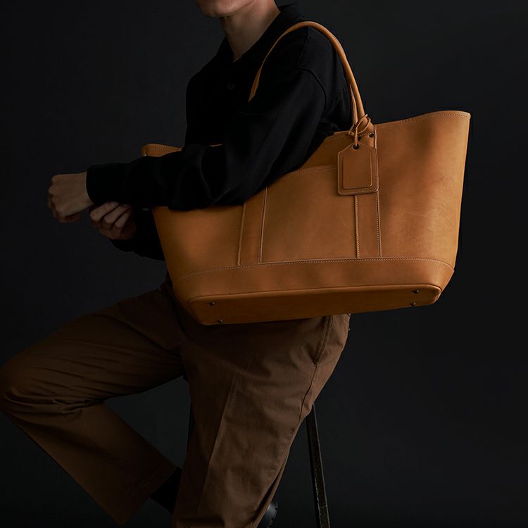 プロ野球選手の野球グローブにも使われる最高級グラブレザーを贅沢に使用し、グラブ作りの技法を落とし込んだ、トライオンのクラフトマンシップが光るビッグトート。