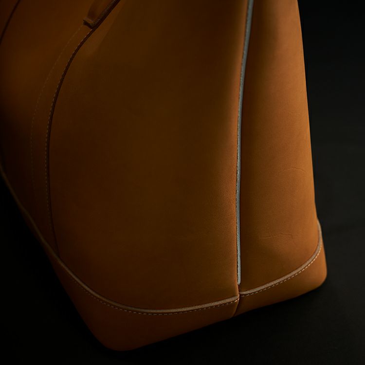 グラブの指部分に用いられる「ハミダシ」を、サイドのマチに応用。グローブでハミダシをつけることで強度が増し、指部分を支える背骨のような役割に。バッグのサイドにハミダシをつけることでピンと立ち上がり、型崩れしにくい丈夫な作りに。