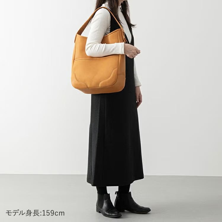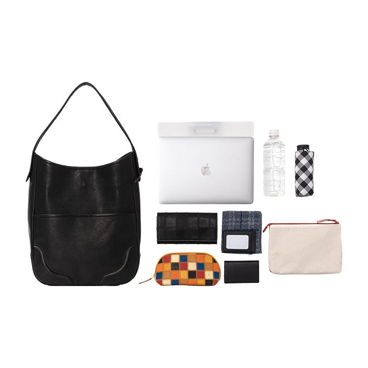 オンオフ問わず、女性でも日常使いしやすいサイズ感。A4/13インチPCが縦に入る大きさで、開口部はスナップボタンで留める仕様。バッグ正面にマグネットボタン付きのオープンポケット、内部はオープンポケットとジッパーポケット付き。