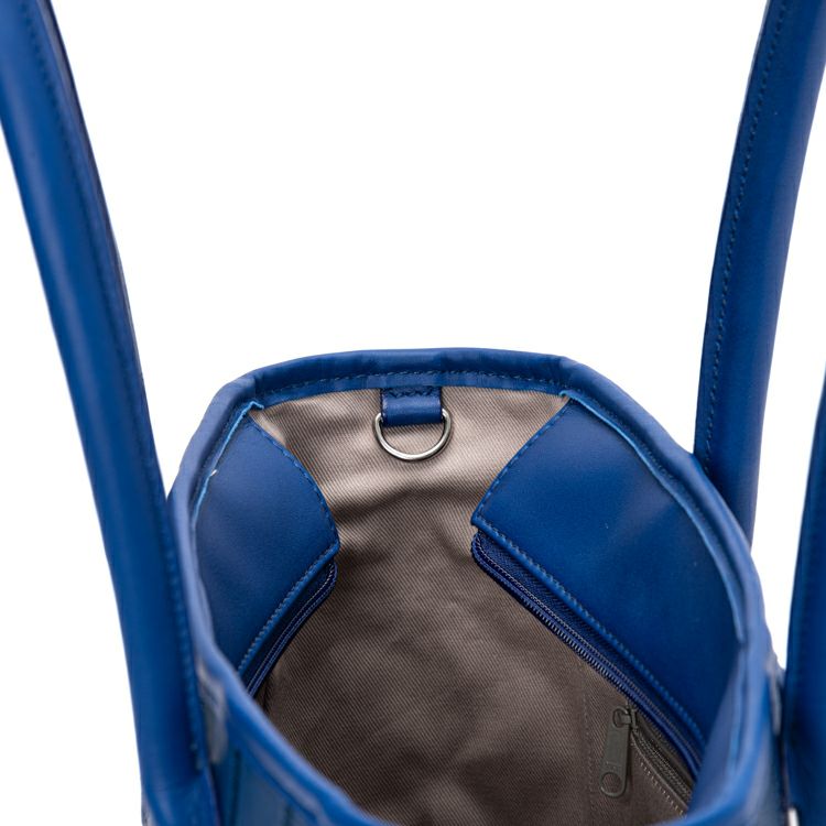 内部はマチありのオープンポケット2つ、ジッパーポケット1つ付きで、小分け収納に便利。開口部サイドには、キーホルダーなどが装着できるキーホルダーリングを付けました。