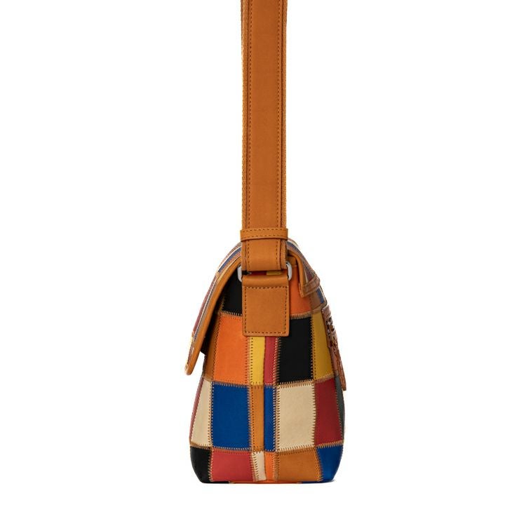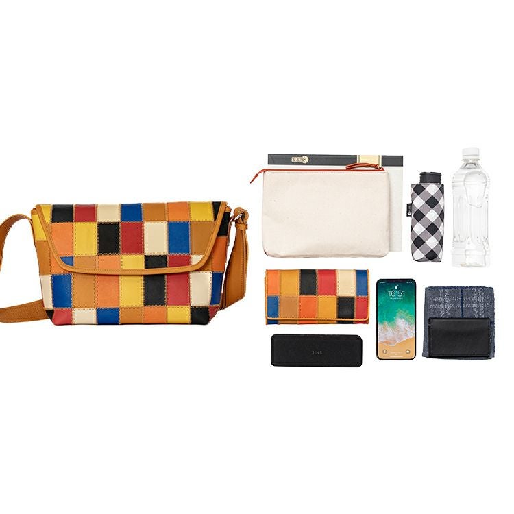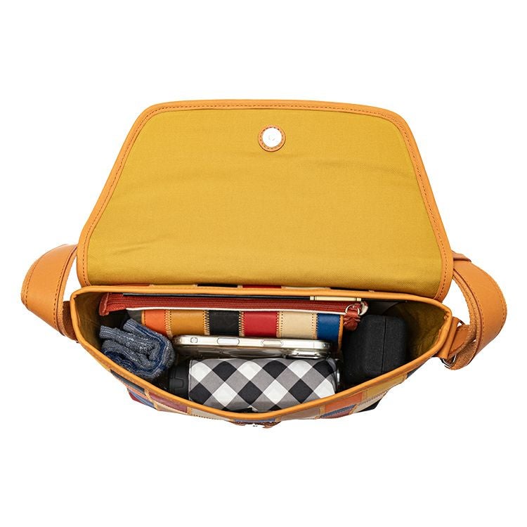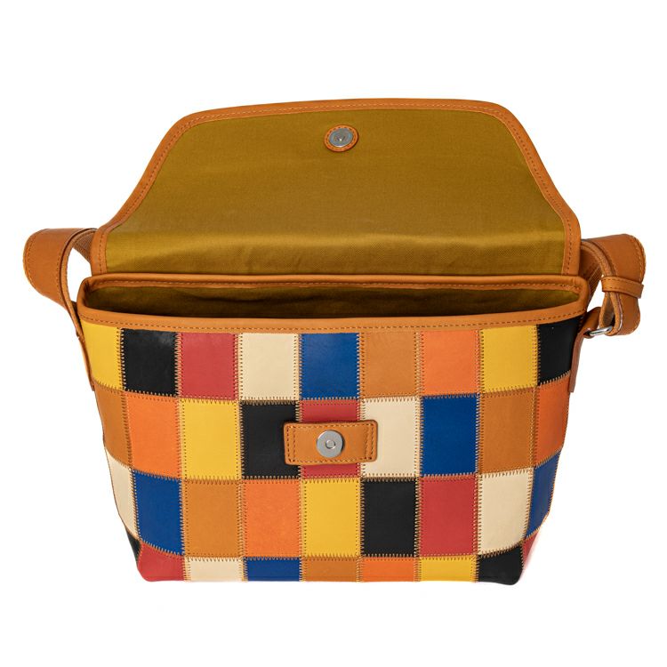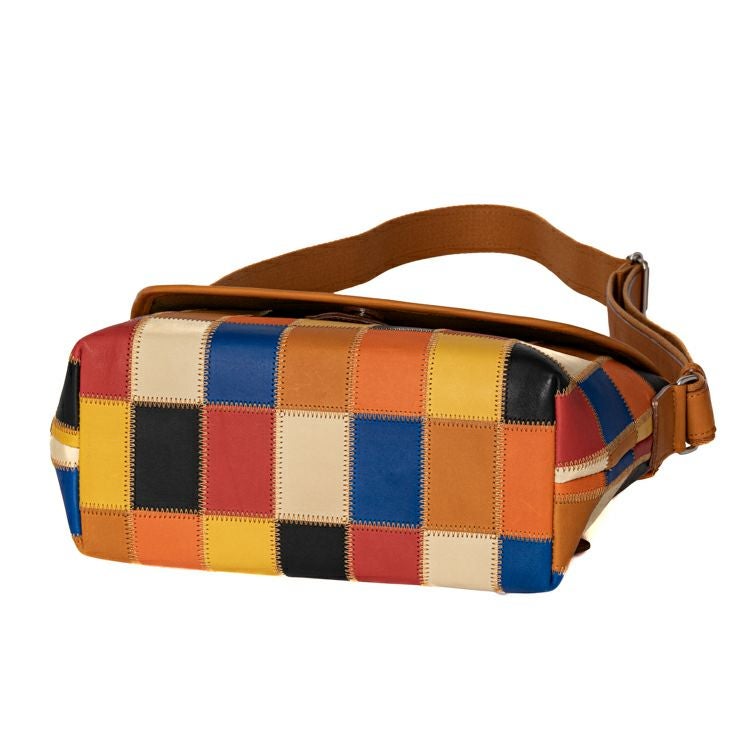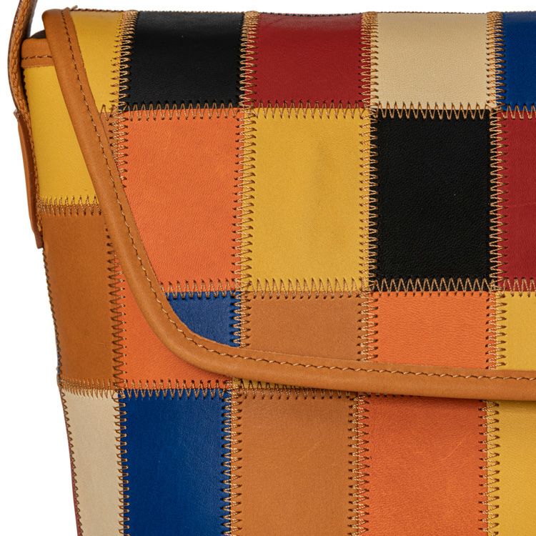 華やかなマルチカラーの色合いとパッチワークの個性的なデザインで、たっぷりとした収納力が魅力のレザーショルダーバッグ。普段使いはもちろん日帰り旅行などにも使えて便利。