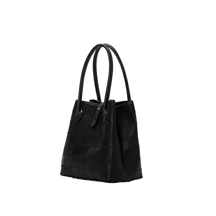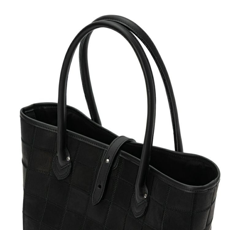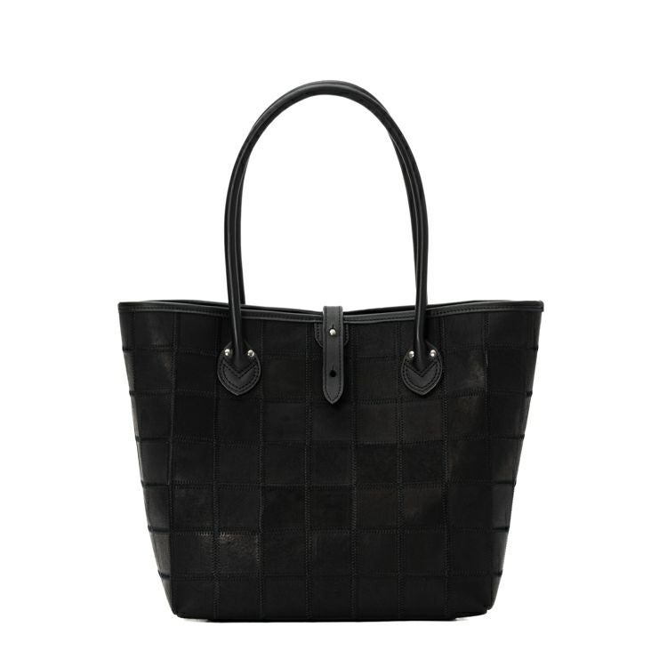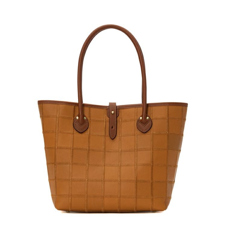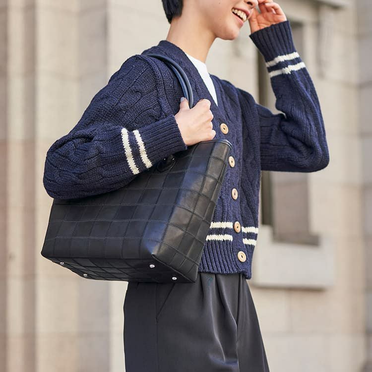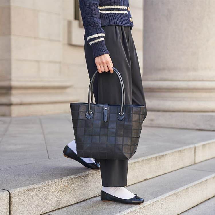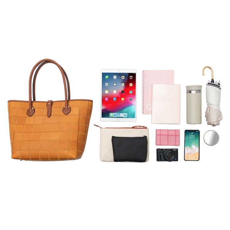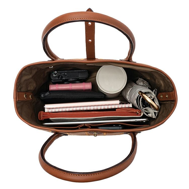 長財布やポーチ、スマートフォン、手帳などがしっかり収まり、必要なものをすっきり持ち運べるミディアムサイズの本革トート。