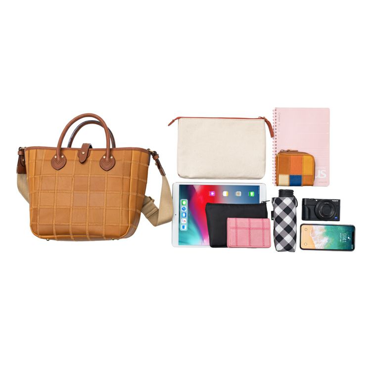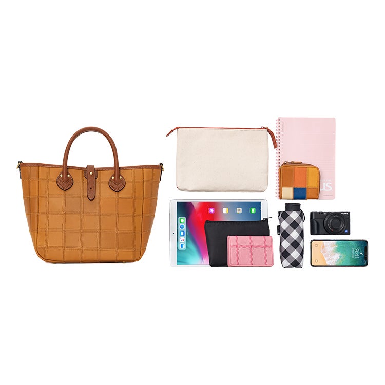 見た目はコンパクトながら、タブレットやノート、ポーチ、折りたたみ財布、ペットボトル、カメラ、スマートフォンなど、外出時に必要なアイテムをしっかり収納可能。