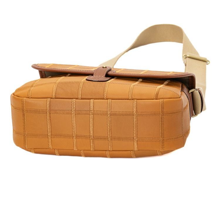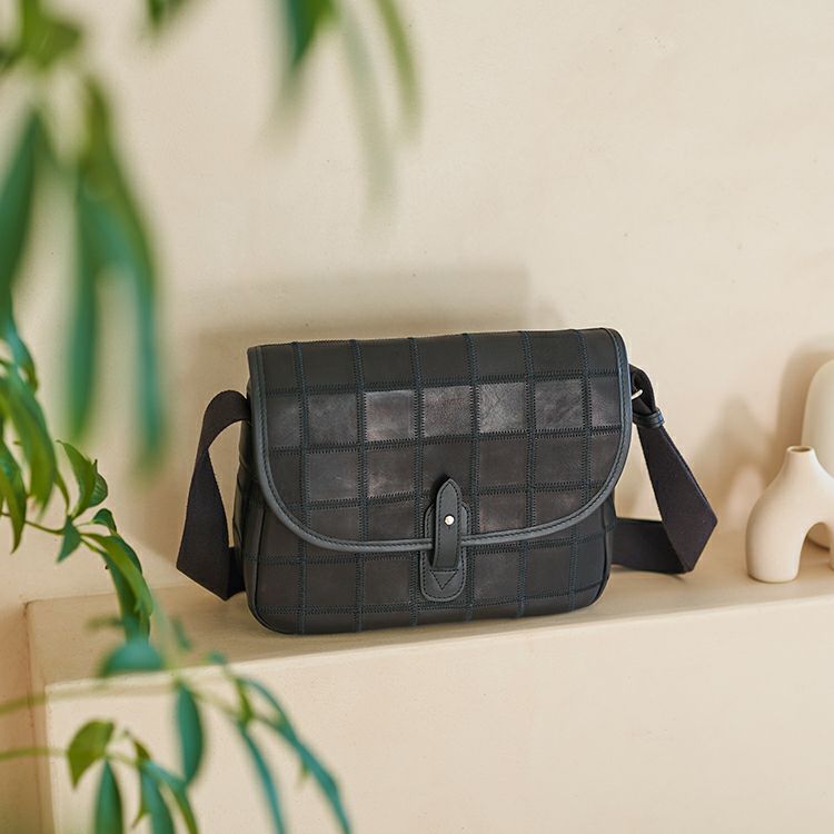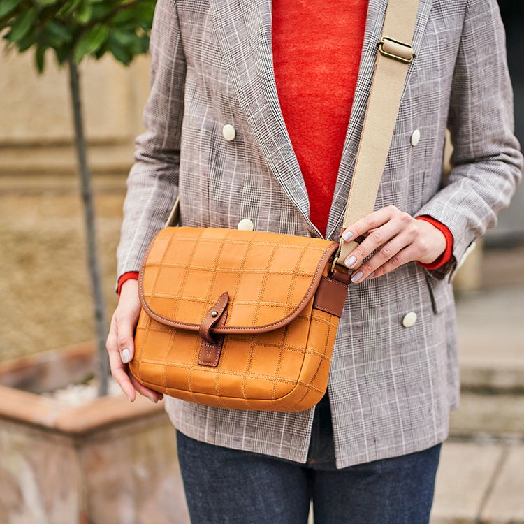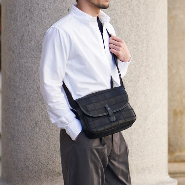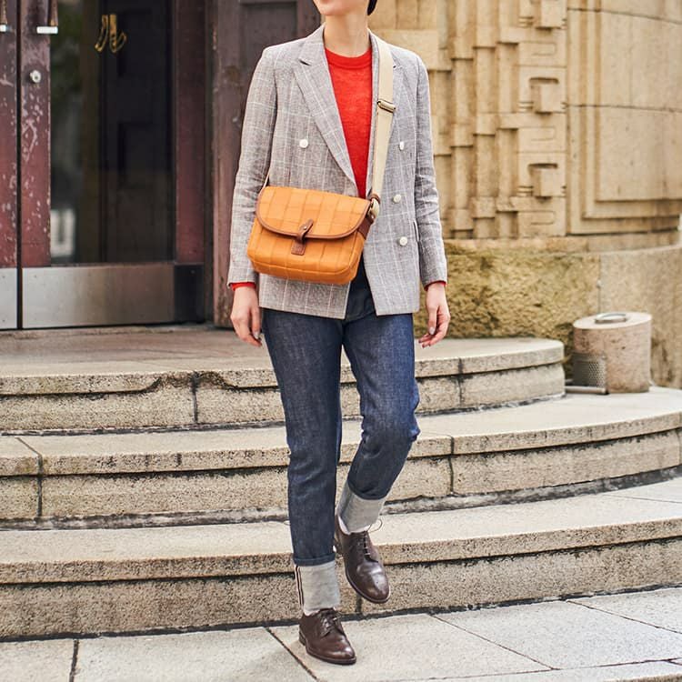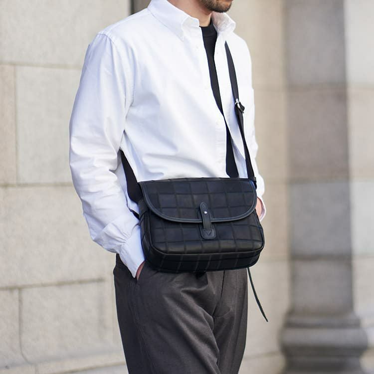 どこか懐かしさを感じるフラップ型のフォルムに、革の質感とニュアンスが重なる佇まい。