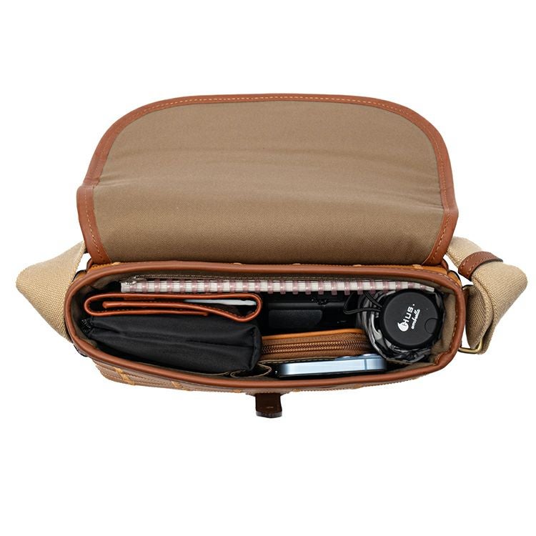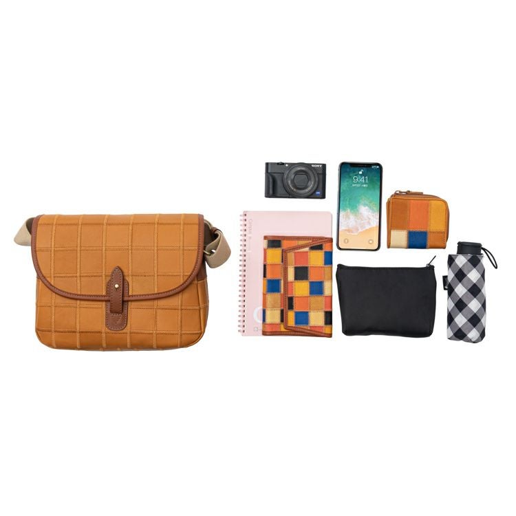 A5ノートやポーチ、折りたたみ傘、ミニ財布、カメラ、スマートフォンなど、日常のお出かけに欠かせないアイテムがしっかり収まるサイズ感。