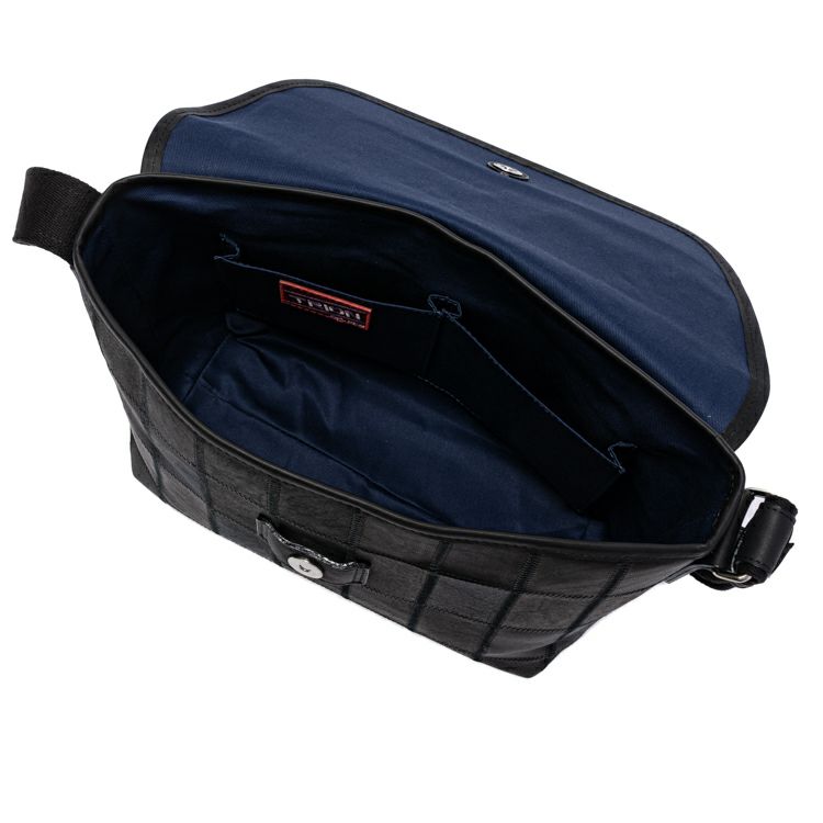 開口部はフラップタイプで、シンプルな動作での開けやすさが魅力。マグネットボタンで留める構造で、ボタンを少し立体的に留めることでフラップが少し浮いたような構造になり、開ける際に指に引っかかり、開けやすくしました。ショルダーストラップ裏面はコットン素材で、肌当たりを良くしました。