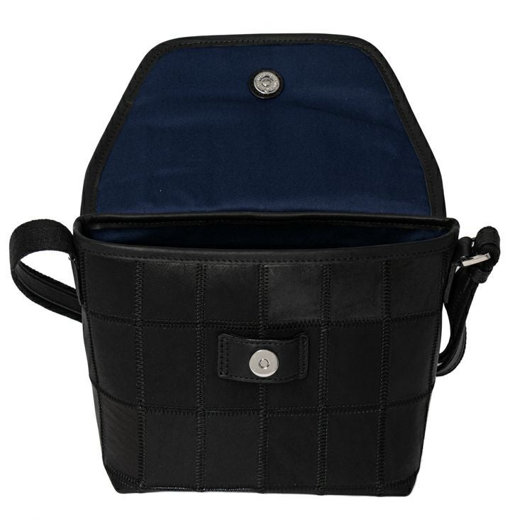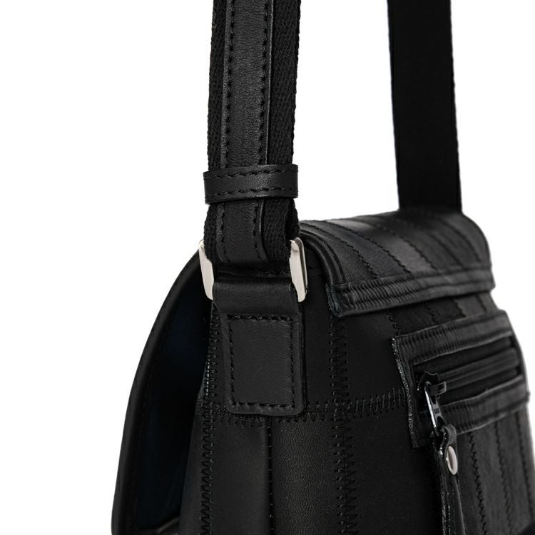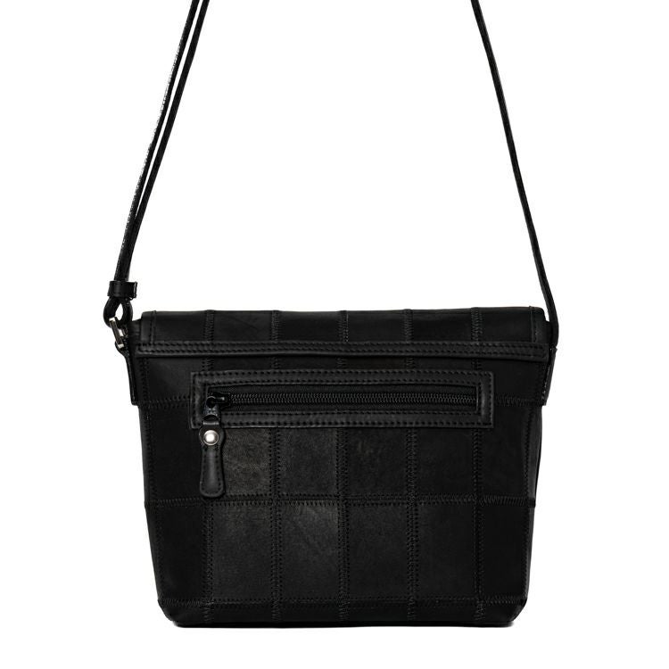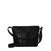 シックな色合いながらパッチワークの個性的なデザインがピリッと効いた、普段使いにちょうどいい小さめレザーショルダーバッグ。