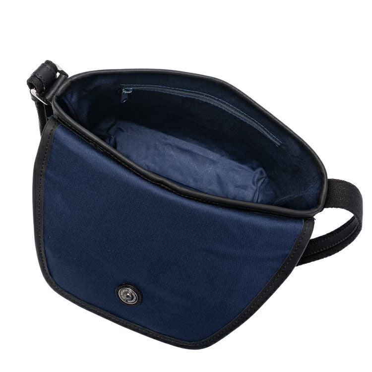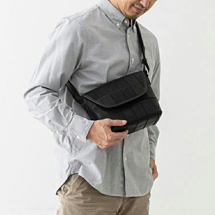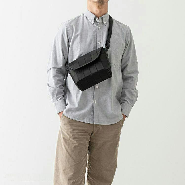 開口部はフラップタイプで、シンプルな動作での開けやすさが魅力。マグネットボタンで留める構造で、ボタンを少し立体的に留めることでフラップが少し浮いたような構造になり、開ける際に指に引っかかり、開けやすくしました。ショルダーストラップ裏面はコットン素材で、肌当たりを良くしました。
