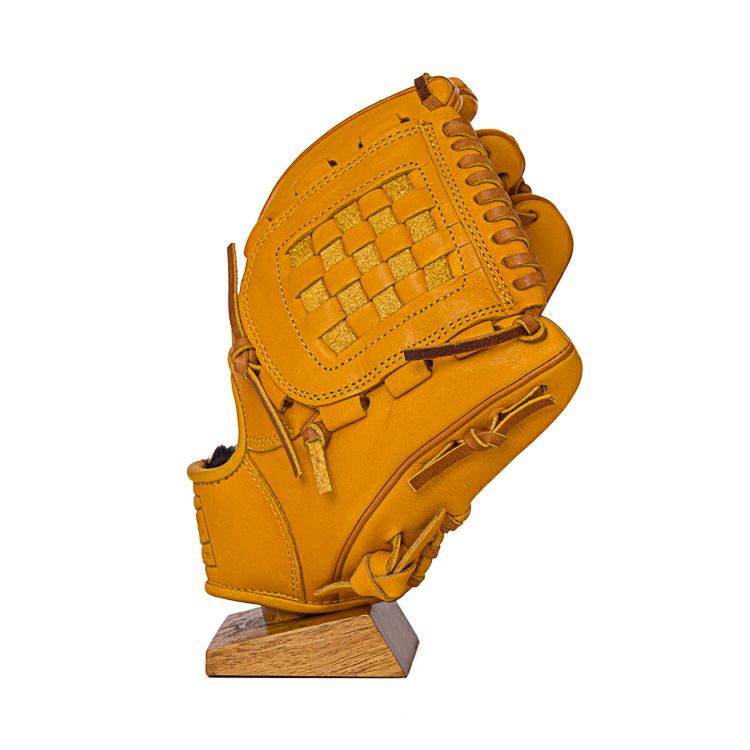 硬式用のオールラウンド型をベースに、インテリアとして飾りやすいよう、大きさを実際のグラブの83%に縮小。時計部分は文字盤が見やすいよう、指股や平トジの位置など修正し、ポケット面を広く見やすくしています。