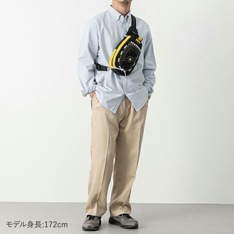 グローブの手首ベルトから着想を得たボディ上部のマジックテープベルトを微調整することで、前掛け時の重心を調整し、より身体にフィットすることができます。