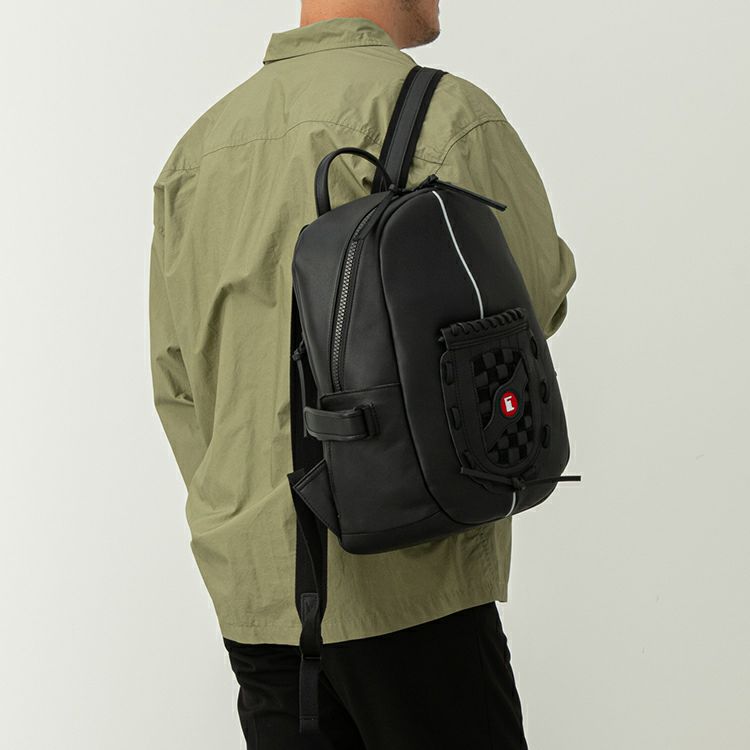 野球グローブに使われるグラブレザーを使用。丈夫な作りで触り心地や匂いもグローブそのもの。バッグ正面にグローブのウェブ部分をあしらったデザインは、オープンポケットとしてスマホやカードケースも収納できます。正面上部のホワイトラインは、野球グラブの指部分に用いられる「ハミダシ」と呼ばれる構造を採用。