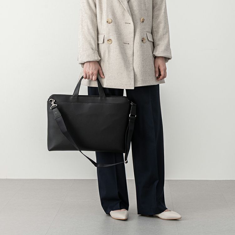 5cmのマチ幅を持たせたことで、13インチPCなどデバイス、A4書類、小物類までゆとりをもって収納可能に。さらに取り外し可能なショルダーベルト付きの2WAY仕様で、シーンやスタイルに合わせた持ち方が選べます。スマートな見た目はそのままに、日常使いの快適さをしっかりと備えたモデルです。