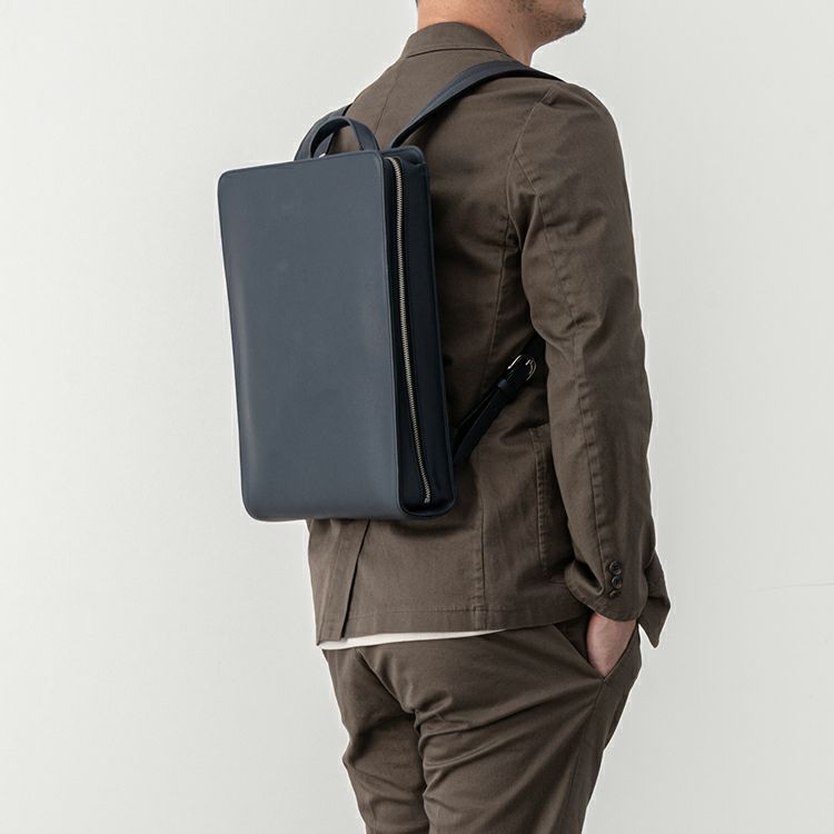 一枚革を贅沢に使用し、フラットな表情が上品に際立つレザーバックパック。ミニマルな見た目できちんと感が必要なビジネスシーンにも馴染みます。