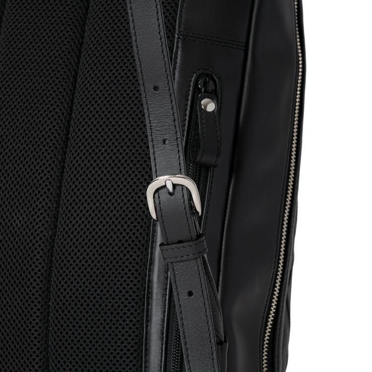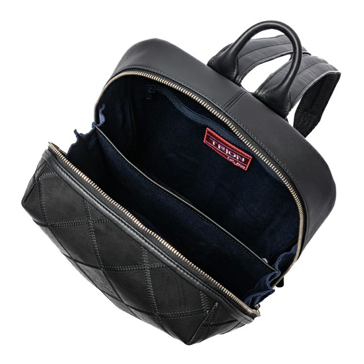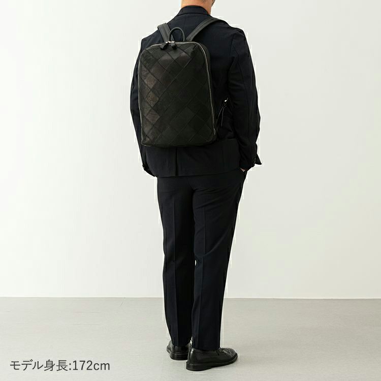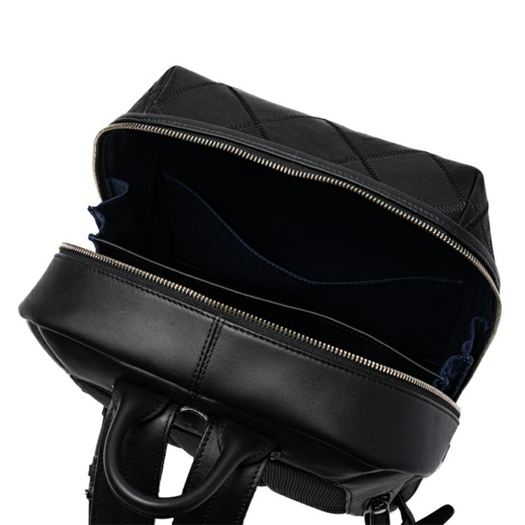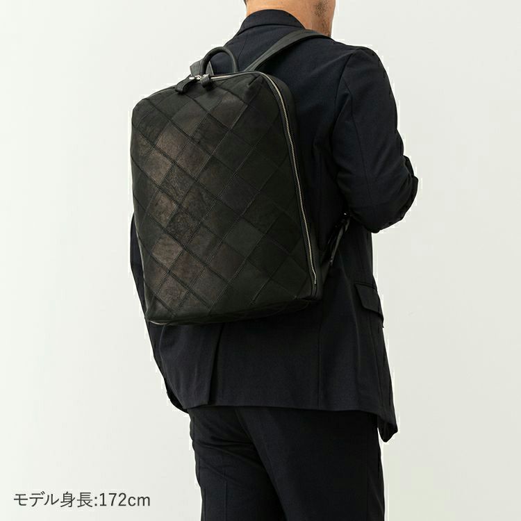 スムースレザーの滑らかさに、繊細なダイヤ柄のパネルが印象的なレザーバックパック。