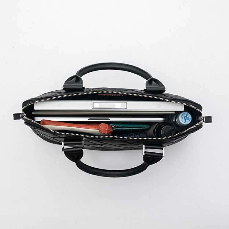ボディ本体は凹凸のある表情の、肉厚で柔らかなタンブルレザーのパーツを1枚1枚丁寧に繋ぎ合わせ、それをダイヤ柄に配置することで、上品で優美さも感じる仕上がりに。ハンドルと取り外し可能な本革ショルダーストラップは肌当たりのいいスムースレザーを使用。