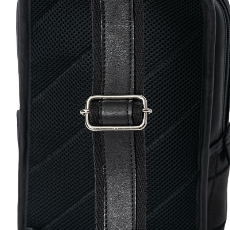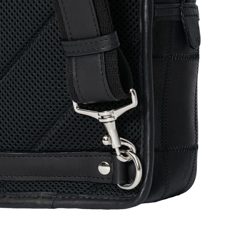 左右どちらでも持てるよう、背面下部にショルダーベルトが付け替え可能なDカン付き。さらに背面はメッシュ素材を採用し、長時間着用した際も蒸れを軽減します。