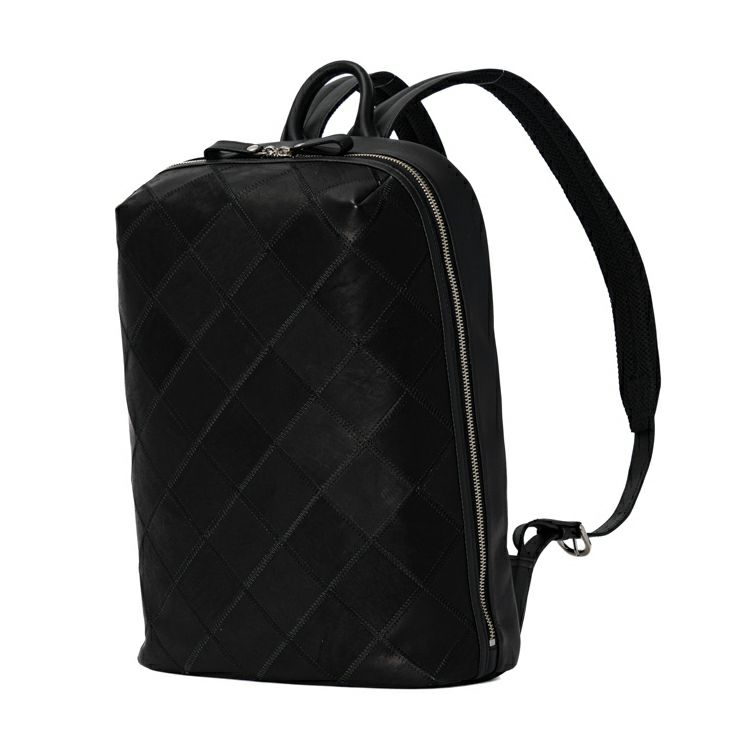 スムースレザーの滑らかさに、繊細なダイヤ柄のパネルが印象的なレザーバックパック。