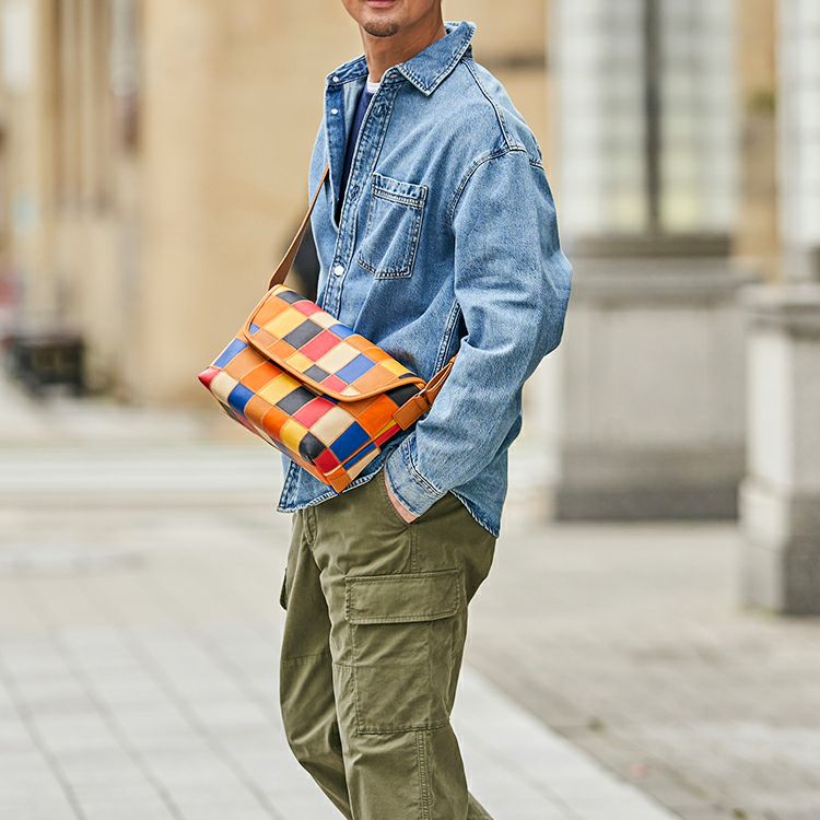 華やかなマルチカラーの色合いとパッチワークの個性的なデザインで、たっぷりとした収納力が魅力のレザーショルダーバッグ。普段使いはもちろん日帰り旅行などにも使えて便利。