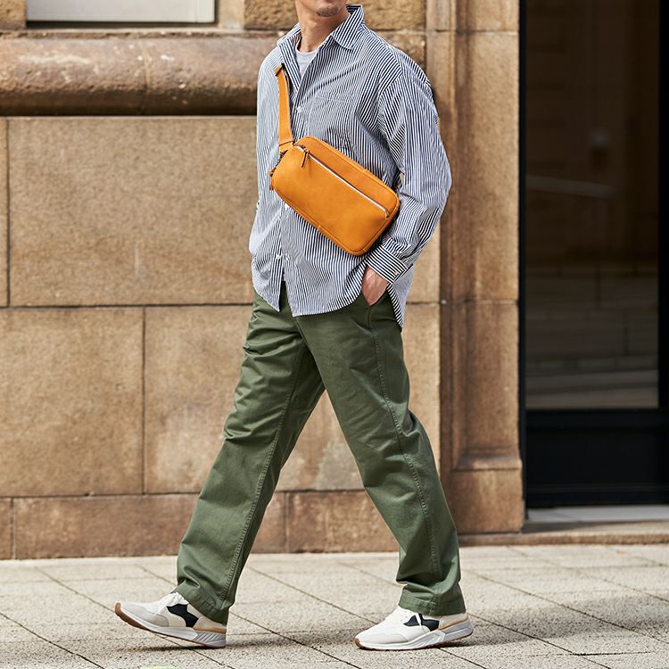 休日に相棒として使える程よい大きさと使い心地にこだわりました。長財布やポーチ類はもちろん、500mlのペットボトル、文庫本なども入ります。開口部はぐるりと大きく開く構造で、前面のジッパーポケットもスマホやカードを入れやすいサイズ感に。