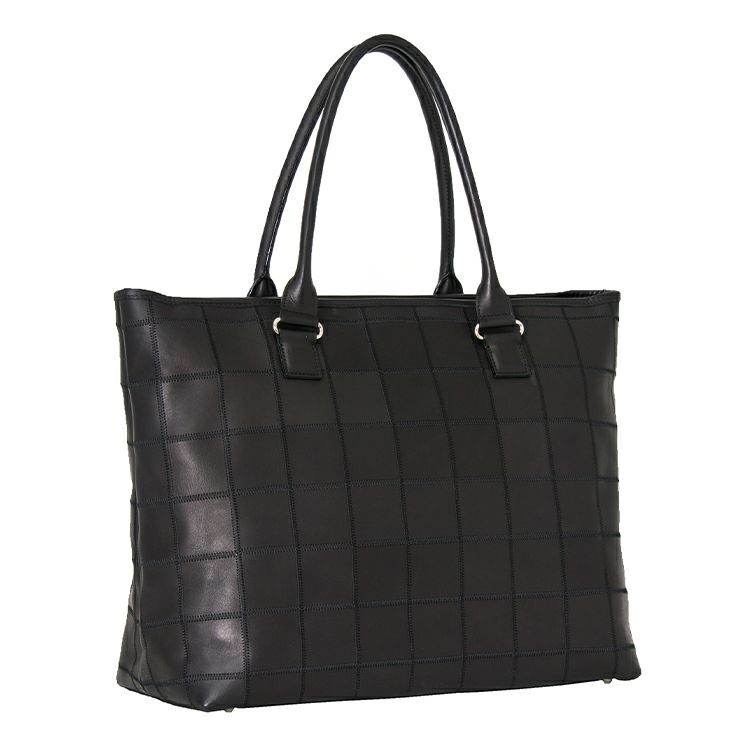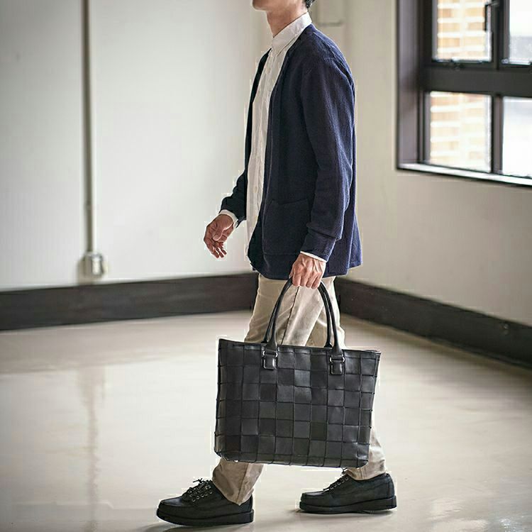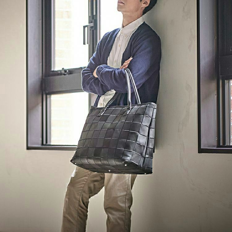 グラブレザーの丈夫さとタフさを持ち合わせ、普段使いできる大きめトートバッグ。パネルの形を正方形にしたことで、規則性のある落ち着いた印象に。