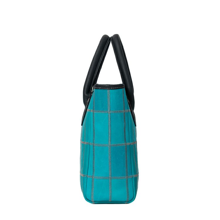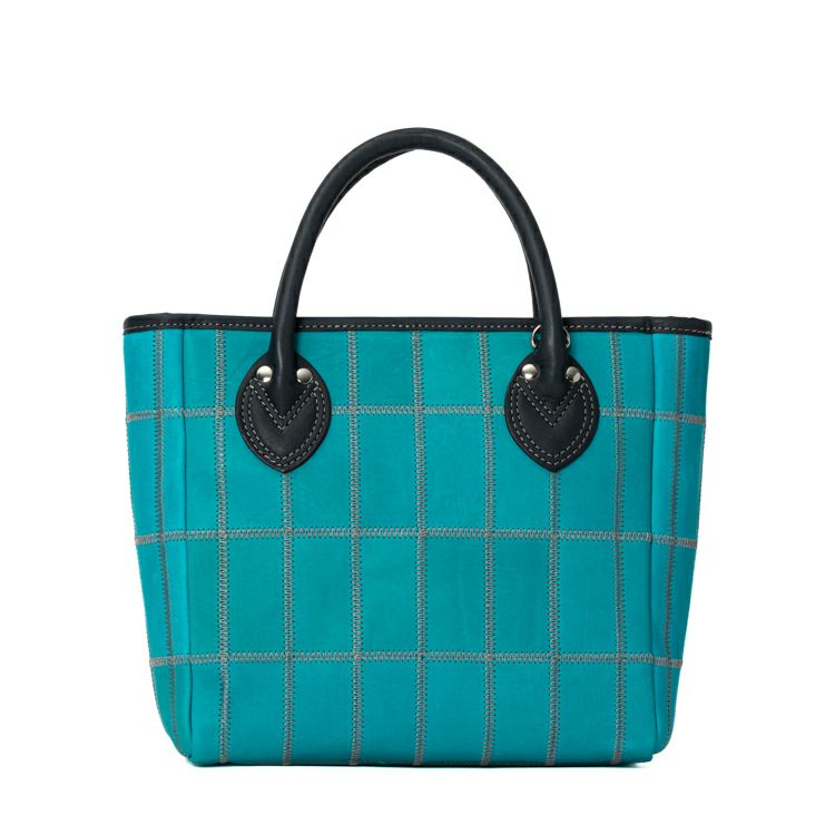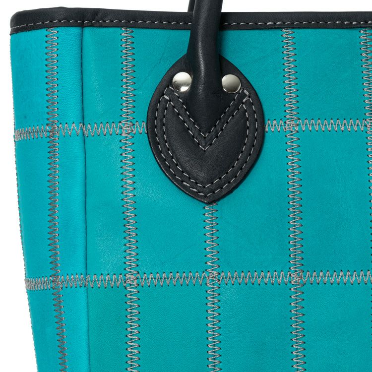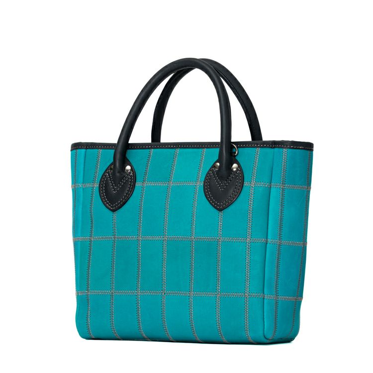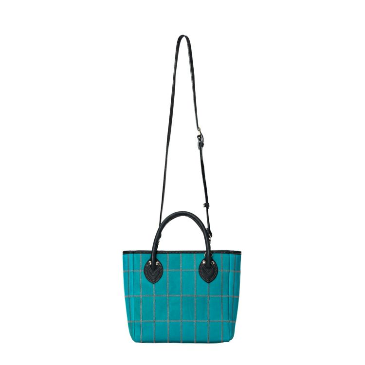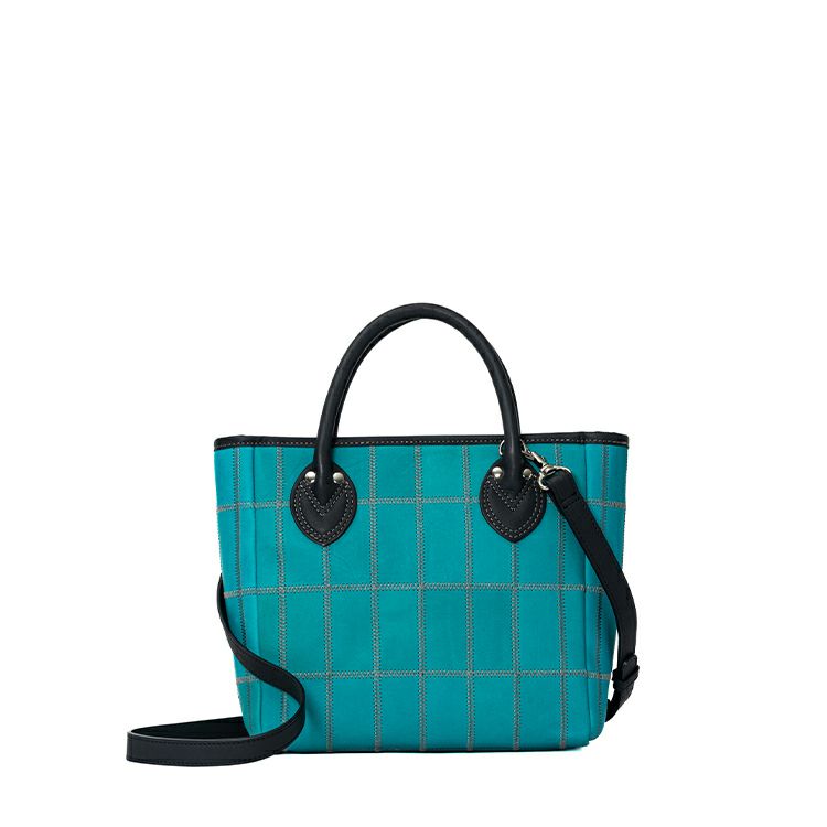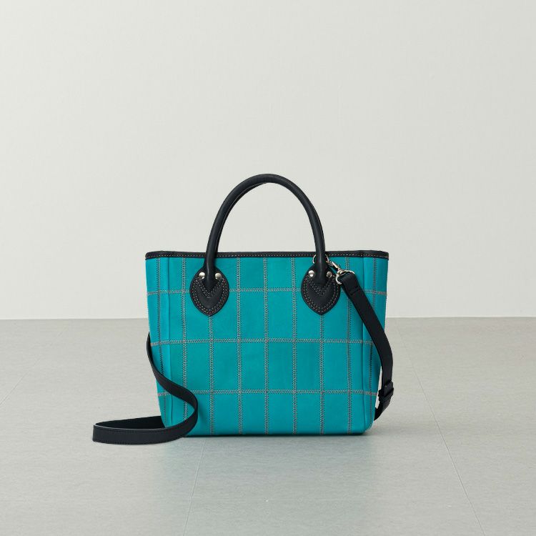 着脱式のショルダーストラップで2Way仕様で使える、コンパクトなショルダートートバッグ。鮮やかなティールと呼ばれるブルーとシックなネイビーの革を組み合わせ、そこにグレーのステッチを効かせた直営店だけの限定カラーです。