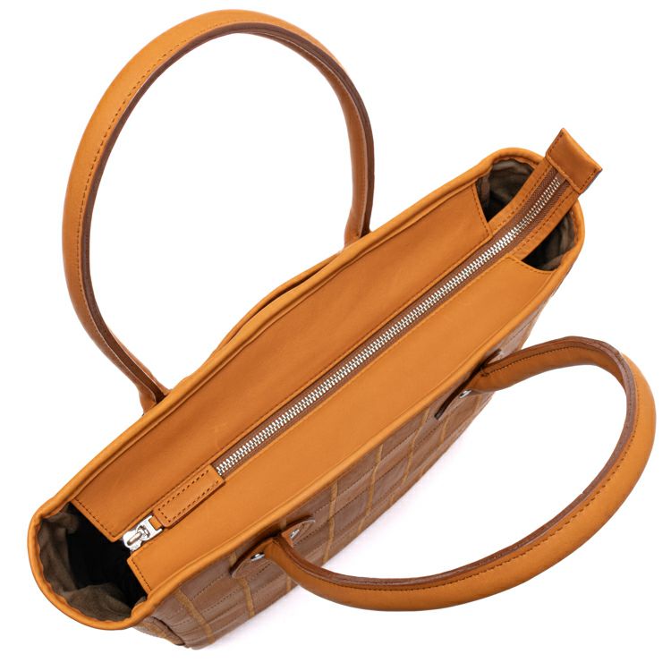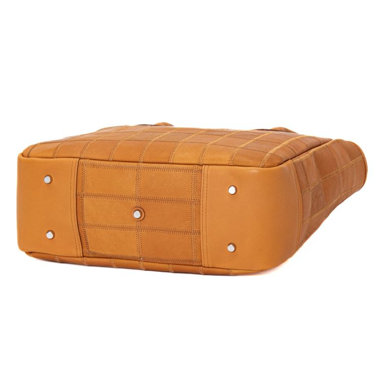 ハンドルの長さを見直すことで、従来よりも肩掛けがしやすくなりました。また、底面には新たに底鋲(そこびょう)を追加。床置き時にも安定し、革の摩耗や型崩れを防ぎながら、美しい状態を長く保つことができます。さらに、サイドマチには一枚革の補強パーツをプラス。荷物を多く入れても型崩れしにくく、耐久性が増すだけでなく、視覚的なアクセントにもなり、全体の印象を整えてくれます。
