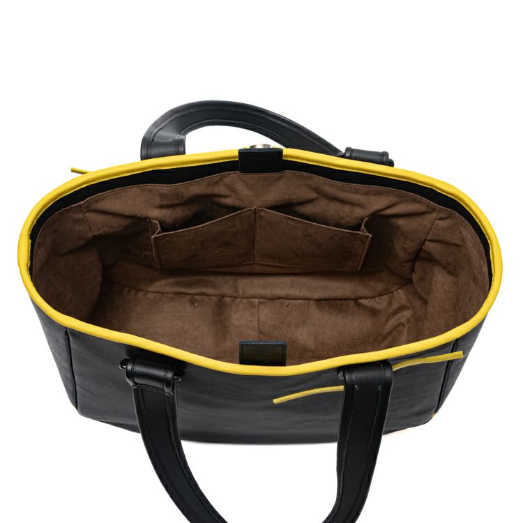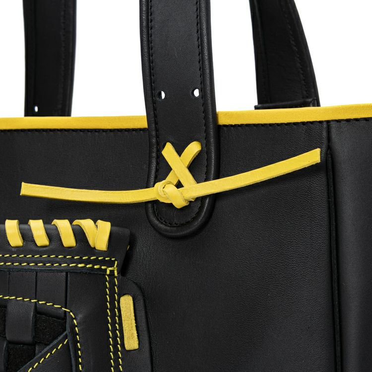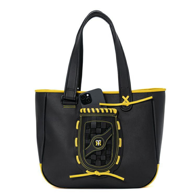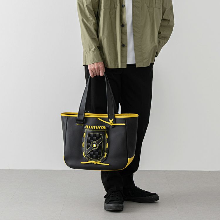 人気のグローブトートをベースに、正面には阪神タイガースのロゴ刺繍をワンポイントで配置。カラーはチームを象徴するブラック×イエローのコンビネーションを採用しました。
