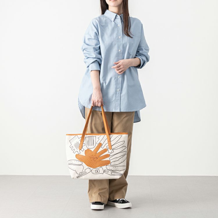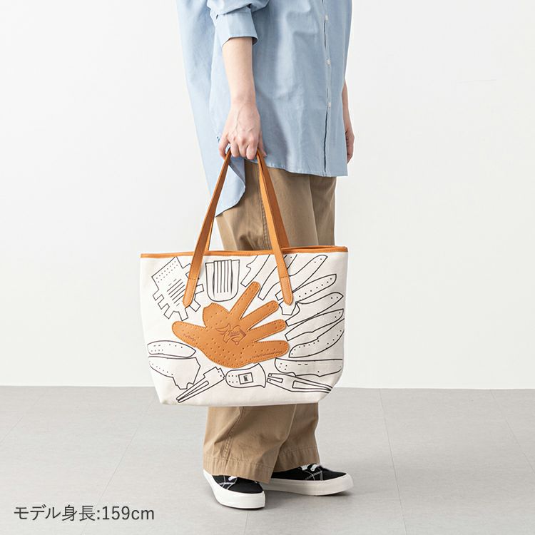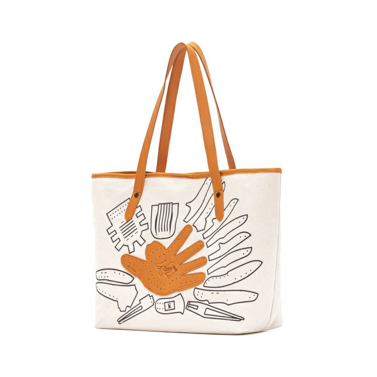 シンプルで無骨なキャンバストートに、野球グローブの「型紙」をモチーフにしたデザインを施しました。