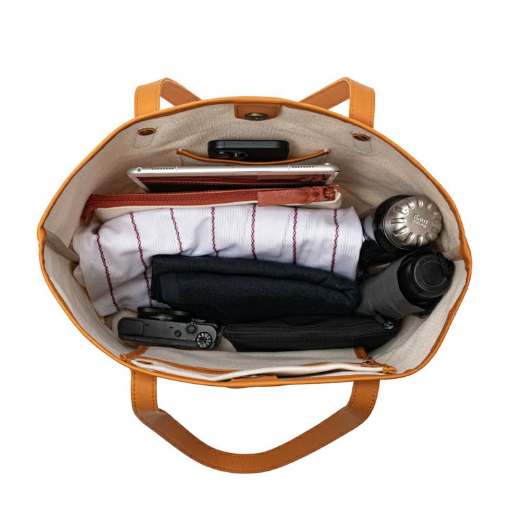 スナップボタンで大きく開く開口部は、荷物の出し入れがしやすく、内側にはジッパーポケットとオープンポケットも備え、整理整頓にも配慮。