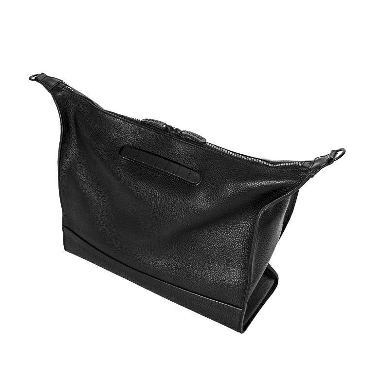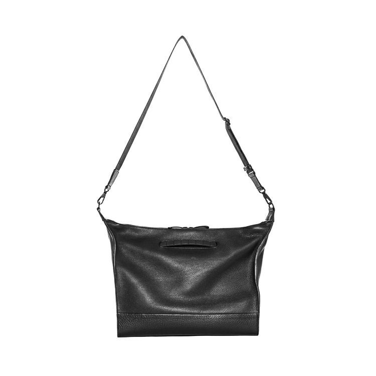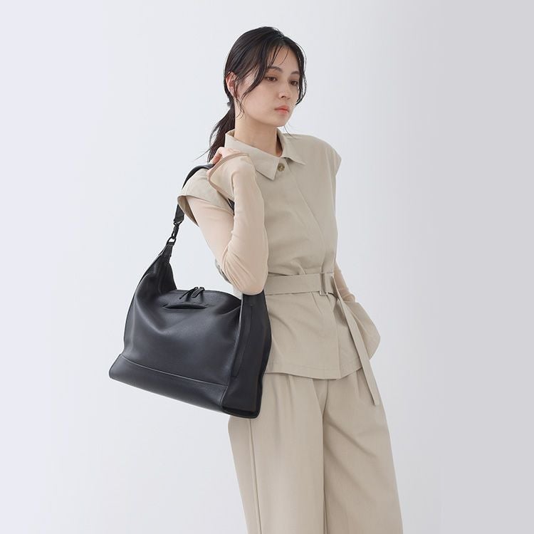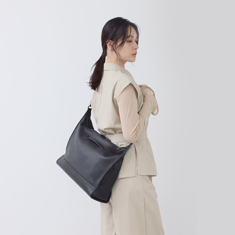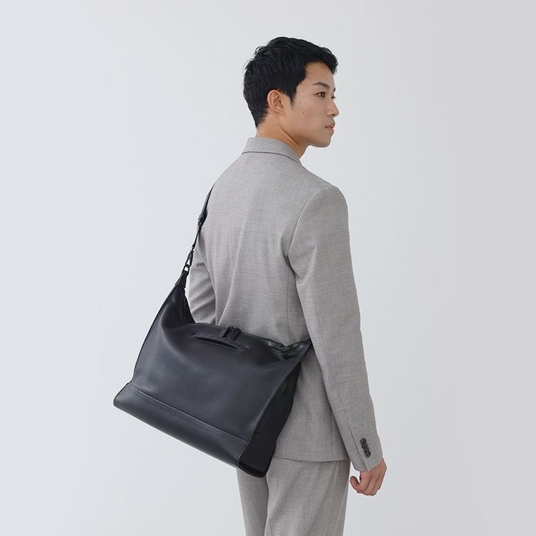 タンブルレザー(シボ革)の重厚な上質感と、オリジナルギミックを用いた機能がデザインで融合。革の上品さをデザインでモードに昇華させ、大人の品と実用性を兼ね備えた存在感溢れる本革トートバッグ。